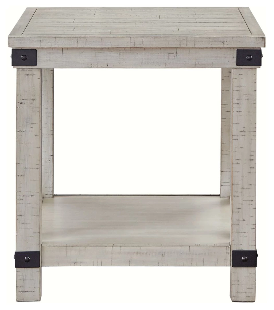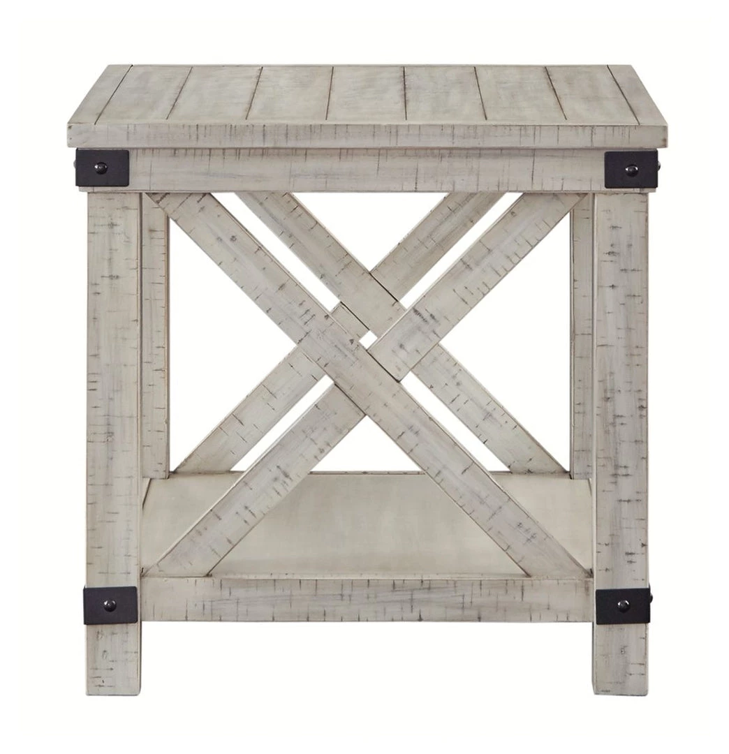Sporting a distressed whitewash finish, this end table is rustic farmhouse living at its best. Crossbuck styling adds striking flair. Metal industrial brackets incorporate an industrial twist.