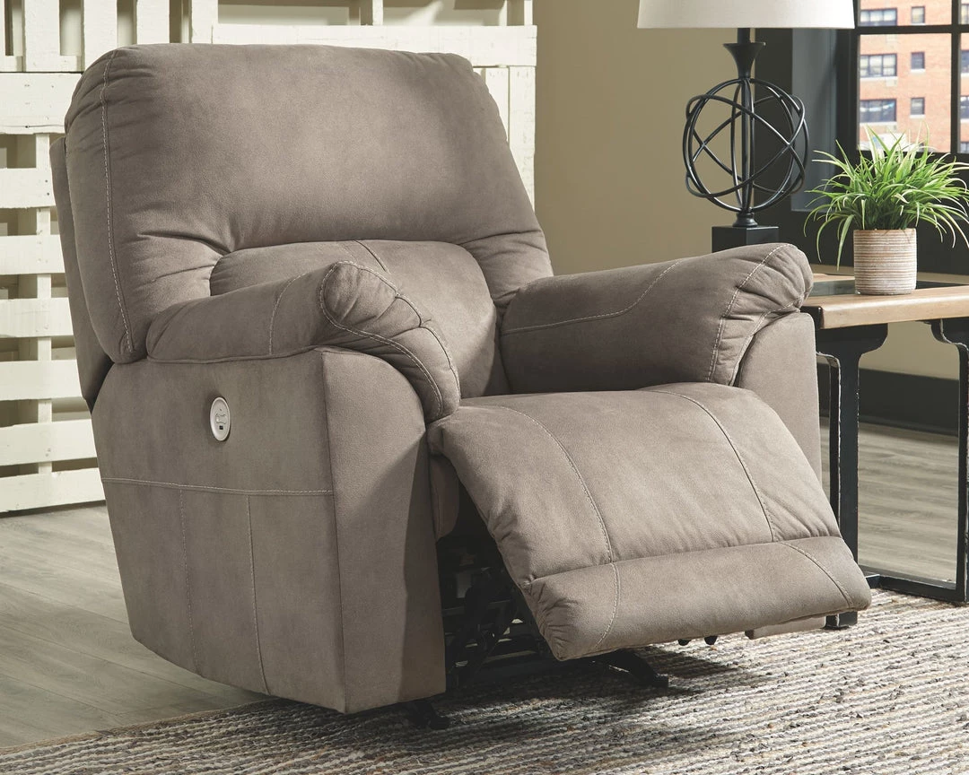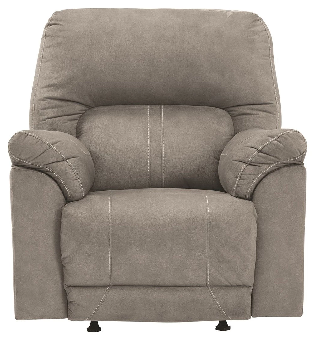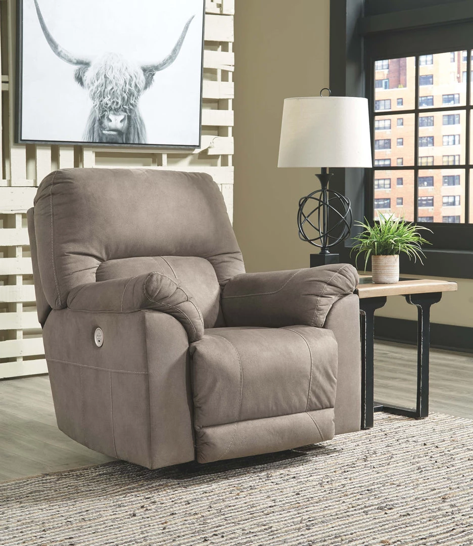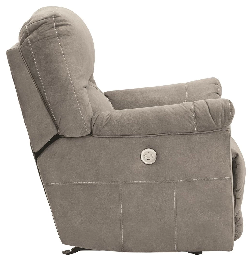 Strike a balance between the indulgent comfort you crave and the cool aesthetic you long for with this power rocker recliner. Offering the cool look of weathered leather, the feel-good slate-tone upholstery takes neutral to new heights. Simply chic divided back tailoring, jumbo stitching and a USB port in the one-touch power control are among the finer details that make all the difference.