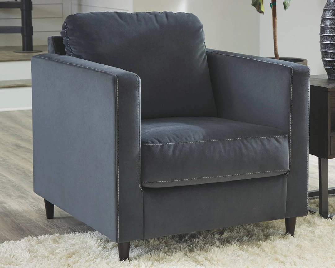 Melding the contemporary style you love with the cozy feel you crave, this chair turns easy living into an art form. The chair’s ultra-linear frame is enriched with generous bolster arm pillows and an indulgent velvet upholstery that’s the stuff dreams are made of. Slim track arms, sleek tapered feet and distinctive accent stitching are among the finer details that set this chair apart.