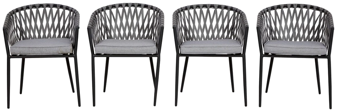 Experience blissful outdoor dining with this outdoor chair set. The simple design is sleek and stylish, while the light gray cushion in Nuvella® high-performance fabric is color-fast and a breeze to clean. Made with lace wicker over a powder coated steel frame, the chairs are stackable to save space when not in use.