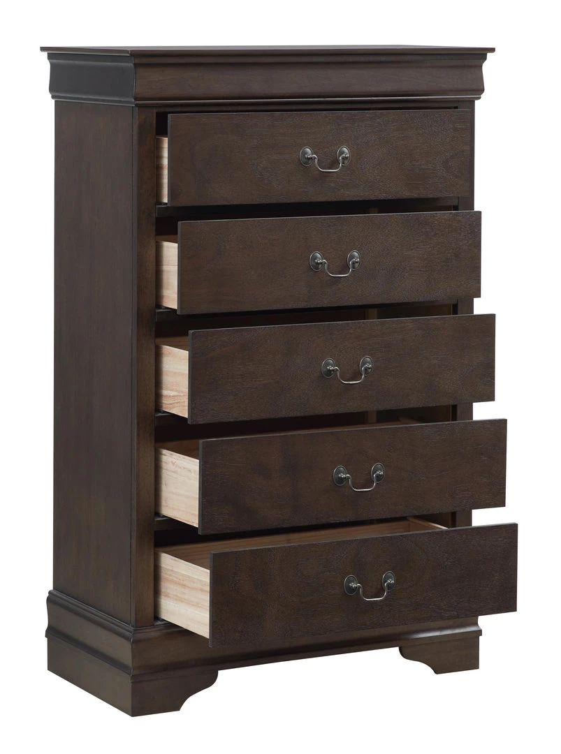 Polished and poised in an elegant deep brown finish, this chest of drawers is a regal dream. Five dovetail constructed drawers provide sophisticated storage. An additional elegant touch is made by the antiqued bronze-tone drawer pulls.