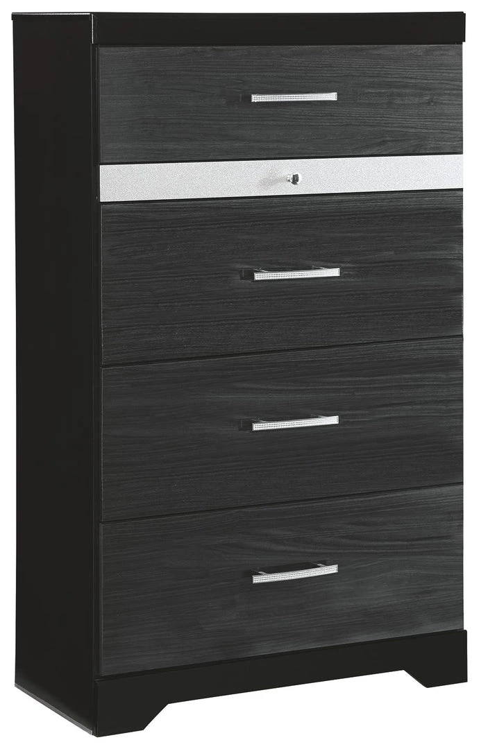 Starry, starry nights. Inspired by Hollywood glam, this richly styled chest of drawers steals the show in a simply stunning way. Its replicated walnut grain is enriched with a high-gloss black finish, made even more dramatic with chrome handles with faux crystals. A felt-bottom six-compartment jewelry drawer with silver glitter finish front accentuates the clean-lined, contemporary aesthetic.