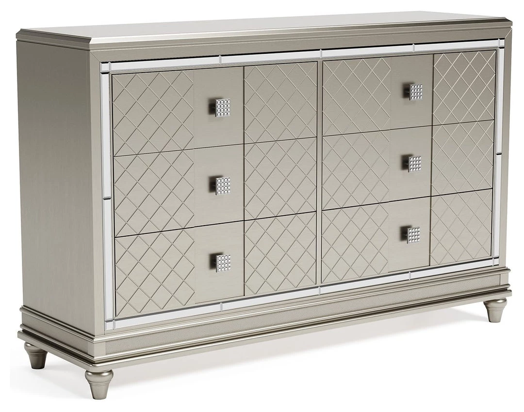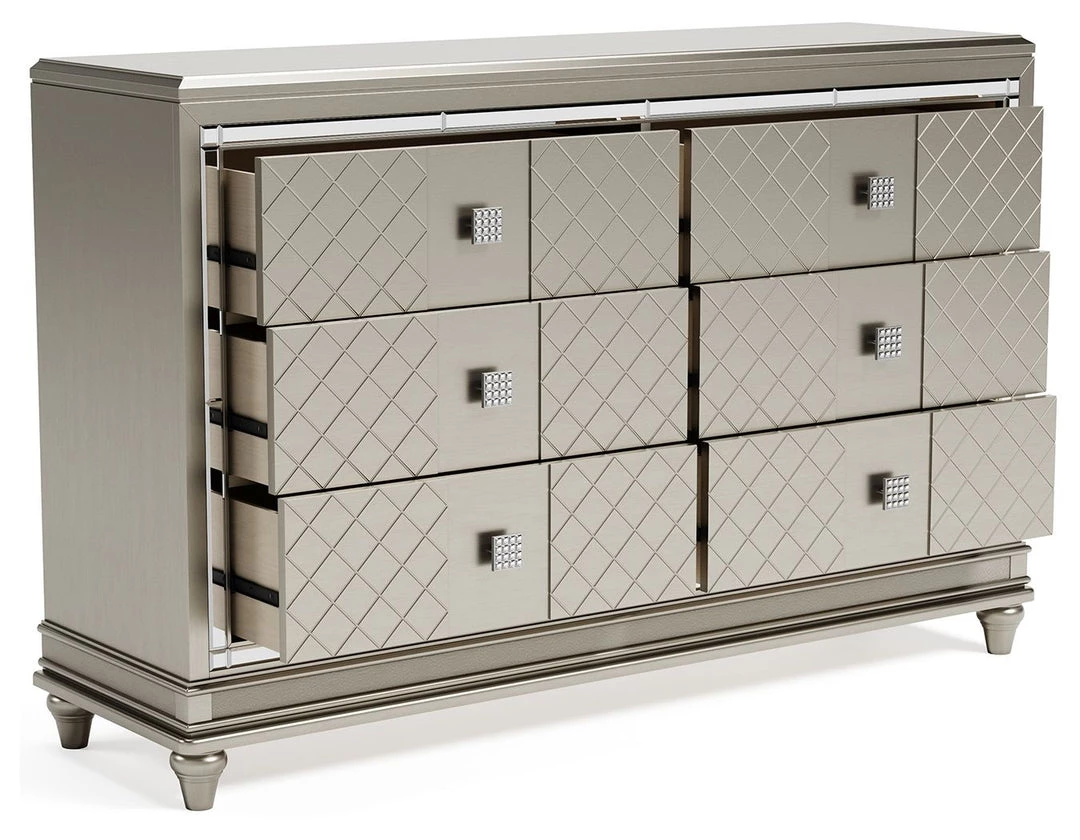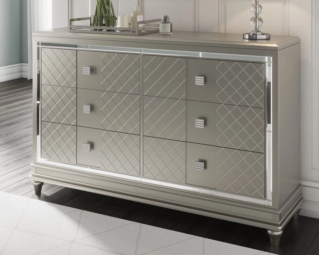 When nothing but the best will do, the opulent finishes and show stopping design of this dresser is nothing short of spectacular. Embossed diamond-patterned drawer fronts with crystalline pulls are surrounded by beveled mirrored detailing for a look that evokes a sense of ease and elegance. What a beautiful reflection of your good taste.