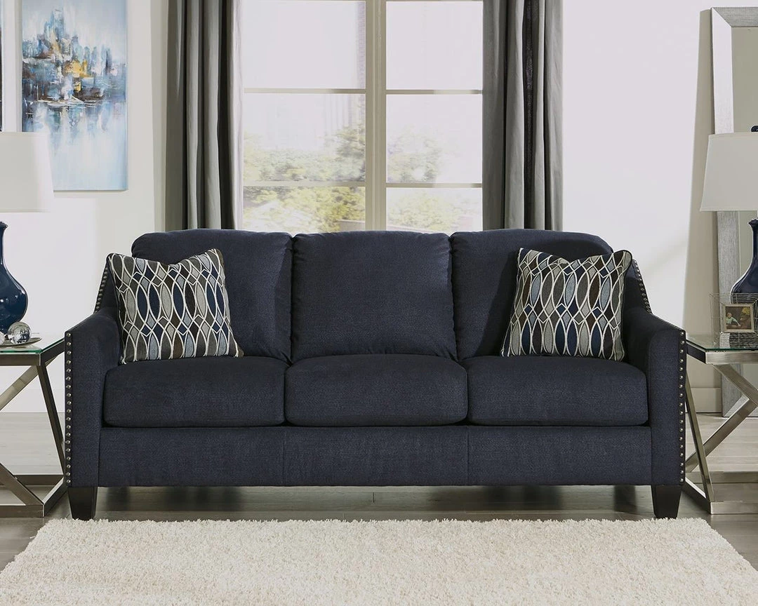 Upholstered in a striking midnight blue fabric with a soft brushed feel, this sofa is undeniably handsome. Sloping arms are beautifully outlined with brushed nickel-tone nailhead. Plush seating sets the scene for toss pillows immersed in a glasswork-inspired pattern design.