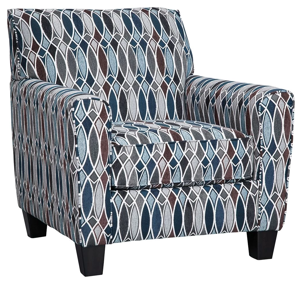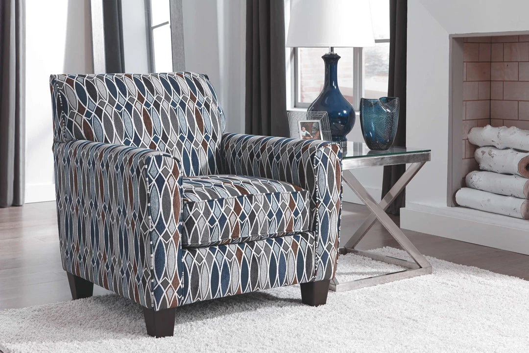 Immersed in a glasswork-inspired pattern design, this accent chair makes it easy to lose yourself in its comfort. Plush cushions with fresh pops of midnight and powder blue give this chair a casually contemporary vibe.