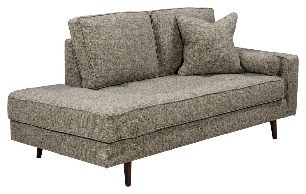 Talk about rolling all elements of mid-century furniture into one swanky piece. Crisp, tight tailoring. Menswear-inspired fabric with subtle tufting. Flared peg legs. And that classic bolster pillow. From every angle, this corner chaise has the corner on authentic retro-chic styling.