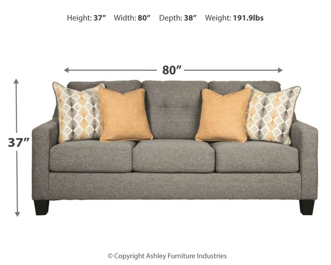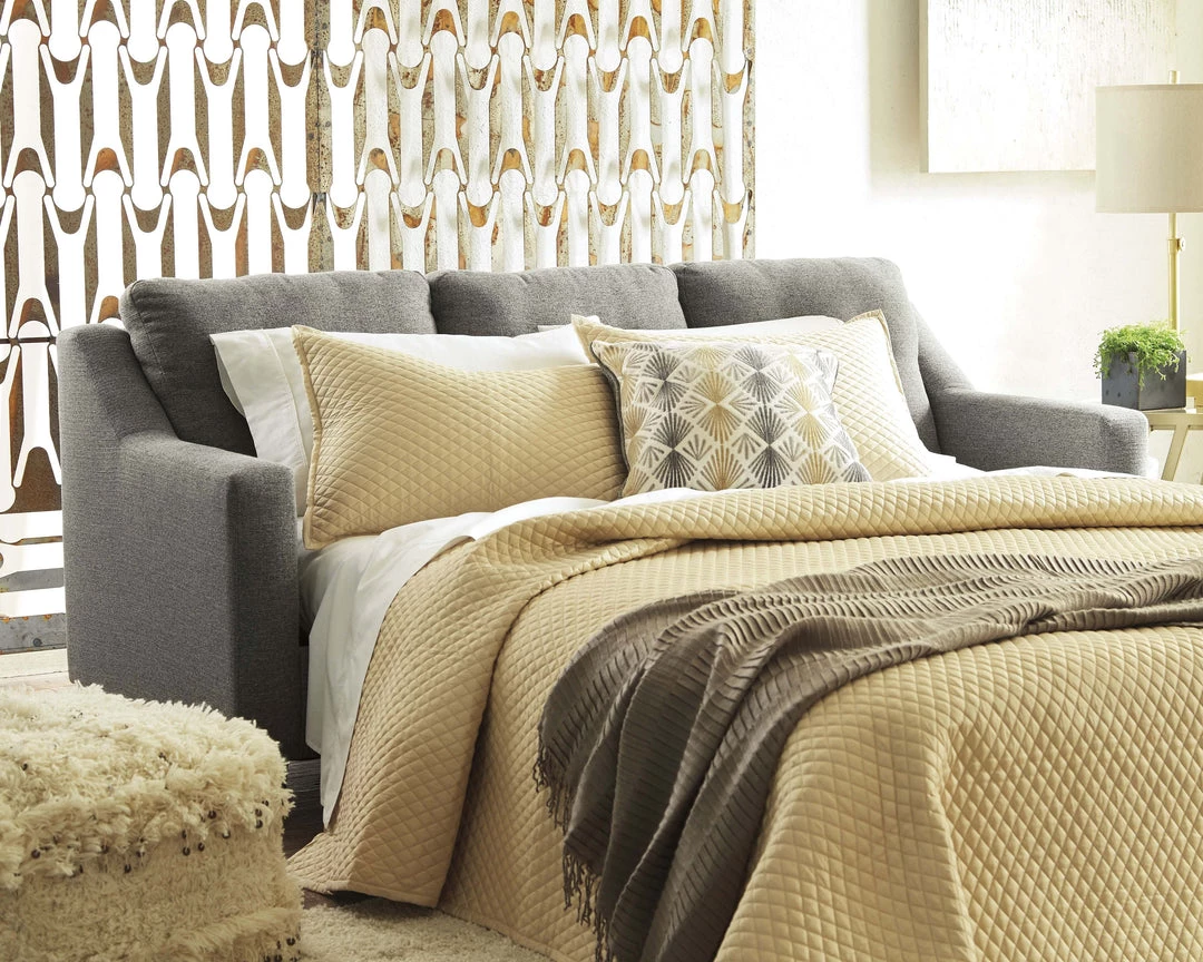 Cool and contemporary with a touch of mid-century flair, this graphite gray sofa sleeper is a sight for sore eyes after a long, hard day. The sofa’s box cushion styling is beautified with button-tufted accents and sloped track arms that go with the flow. Inspired by tailored menswear, the gorgeous gray upholstery with chenille-feel softness is complemented with solid and print pillows in butterscotch and gray. Easy pull-out mattress in quality memory foam comfortably accommodates overnight guests.