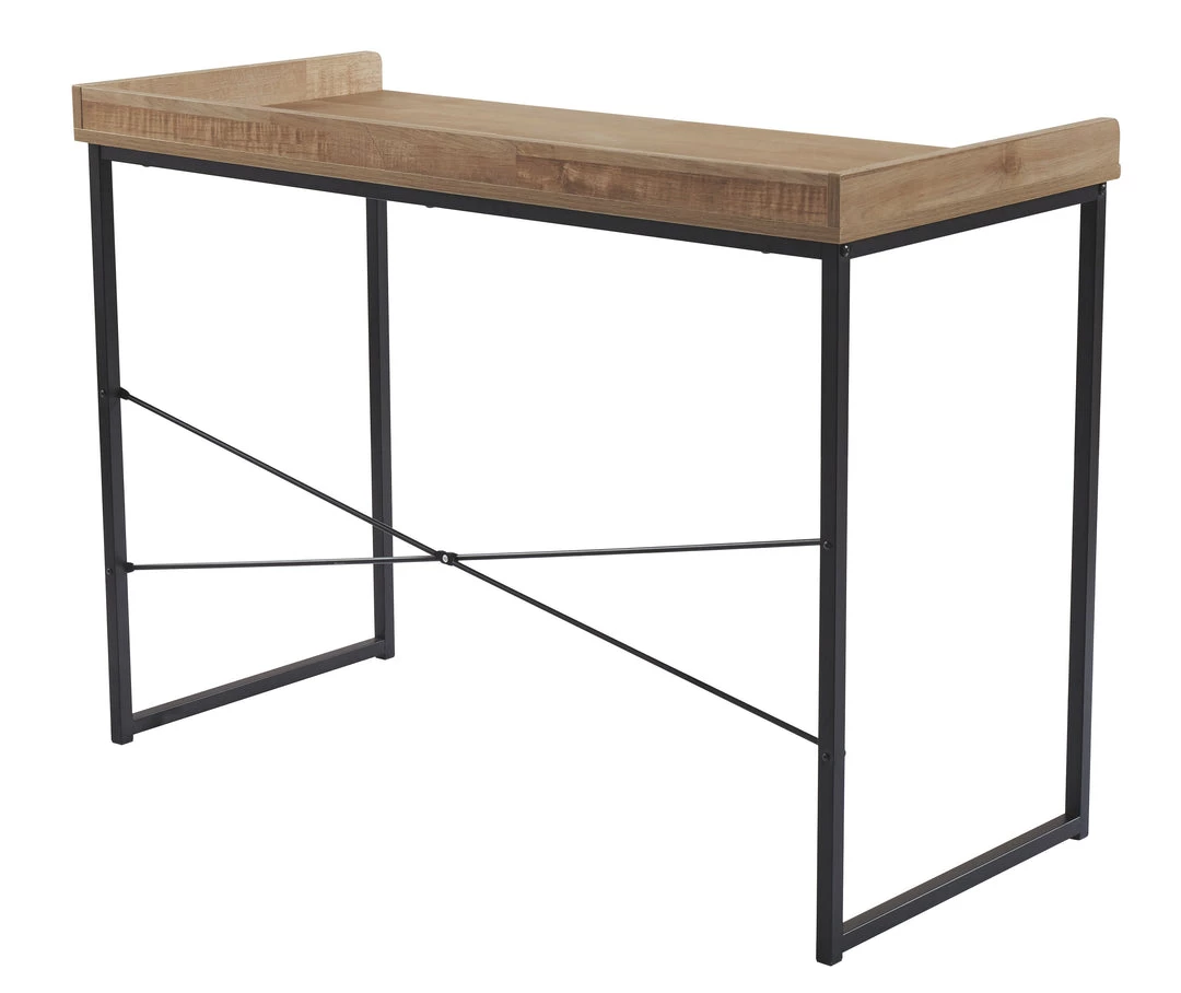 Make a bold statement in a compact footprint with this high-style desk. The striking contrast of its light wood-tone top and sleek black metal frame is so dramatic. Three-sided gallery rail is crafted for form and function.