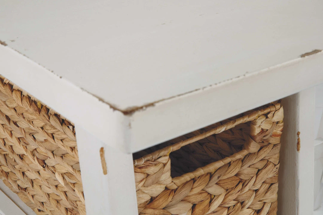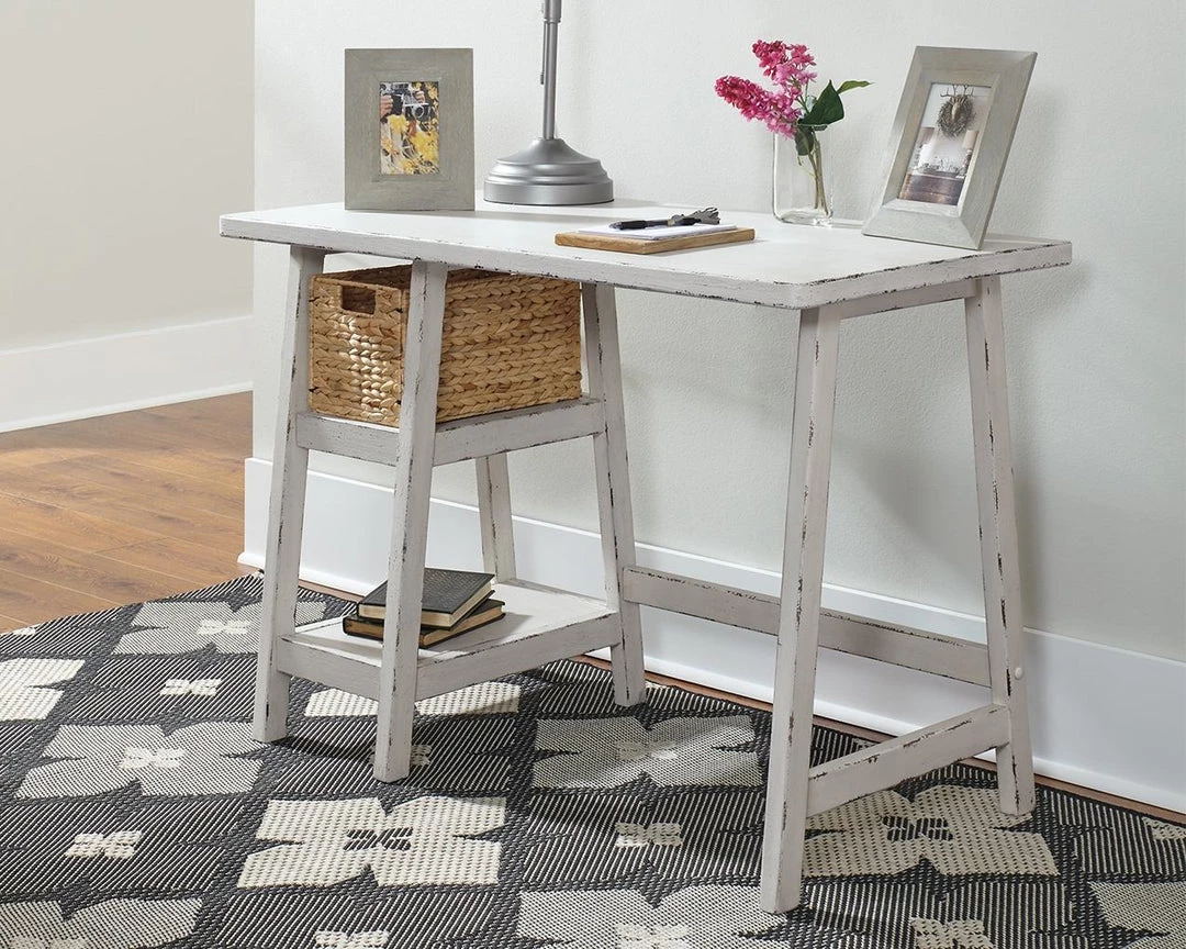 Space-challenged rooms call for simply chic style: like this small home office desk in antiqued white. Clean and lean, this desk’s classic trestle design always works. Heavily distressed finish captures the essence of chipped paint, giving this wood desk a charming salvaged quality. Pair of open shelves and natural water hyacinth basket provide essential storage.