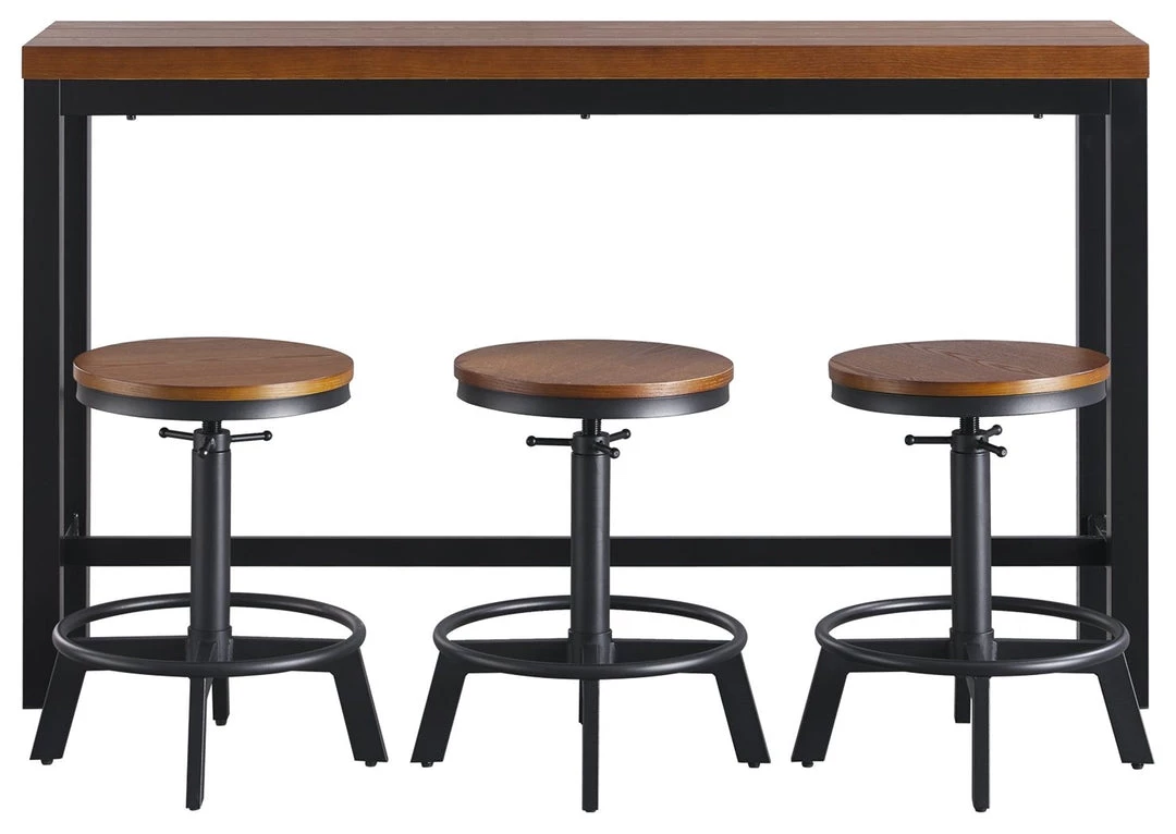 Stealing the scene with ruggedly handsome good looks and rustic charm, this counter height dining table set wins in every category. The table top and stool tops are made with ash veneers, contrasting with the black metal frames for a look that is sure to whet your appetite.