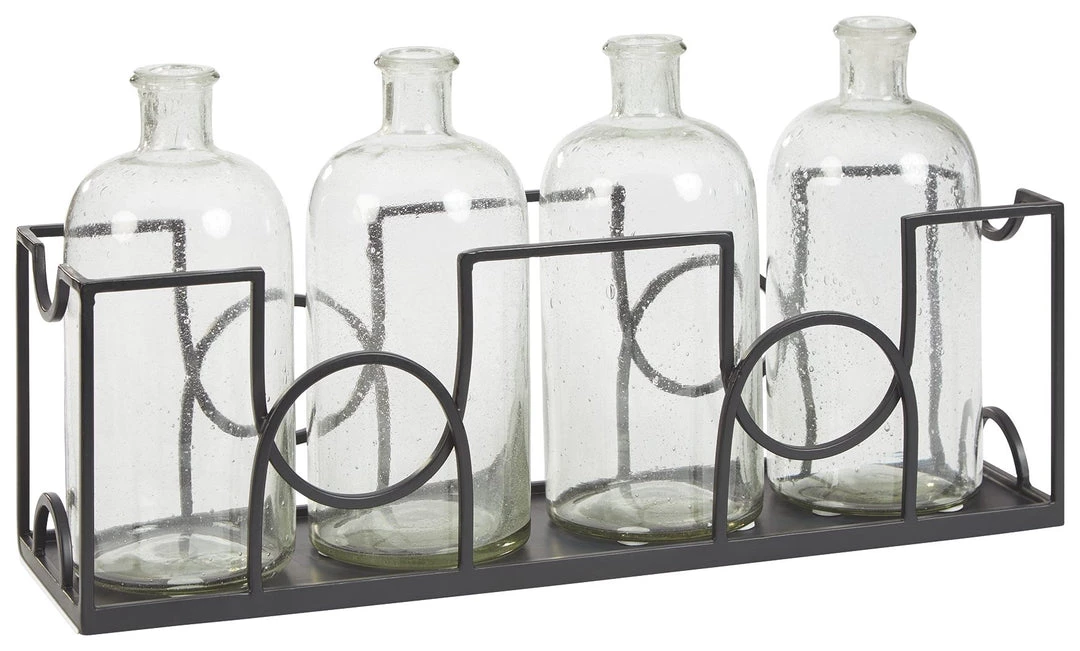 This delicate vase set will clearly show off your style. A black finished metal tray corrals four seeded glass bud vases to display your favorite flowers.