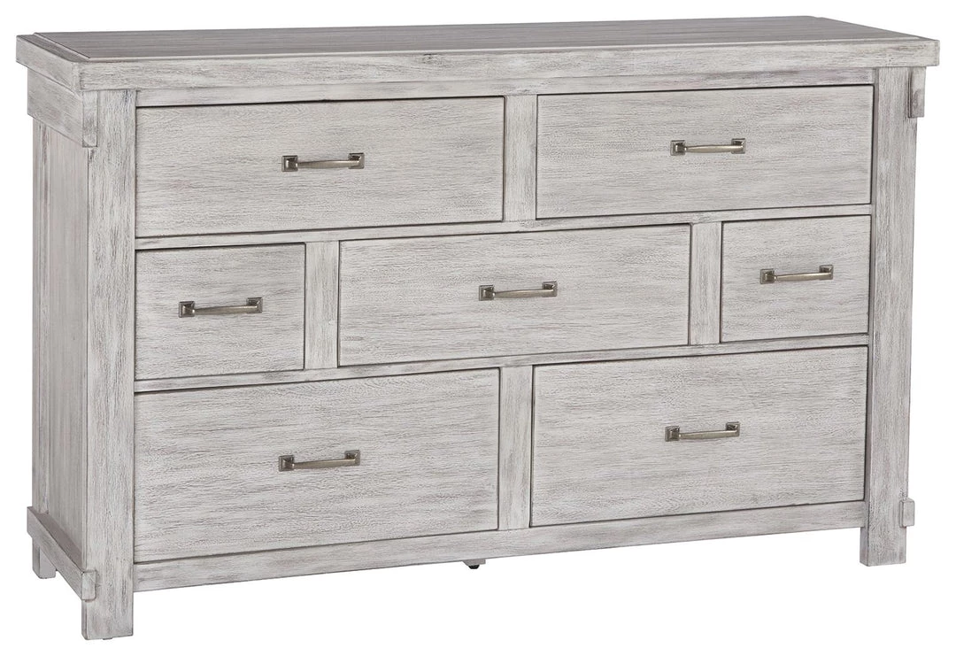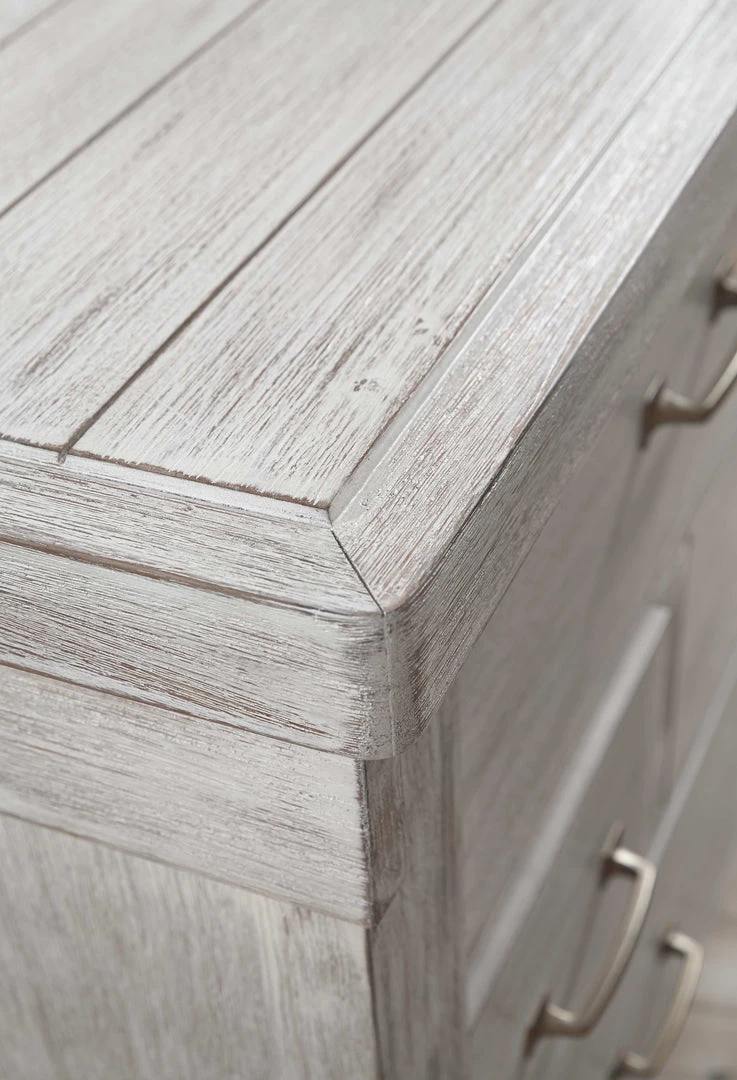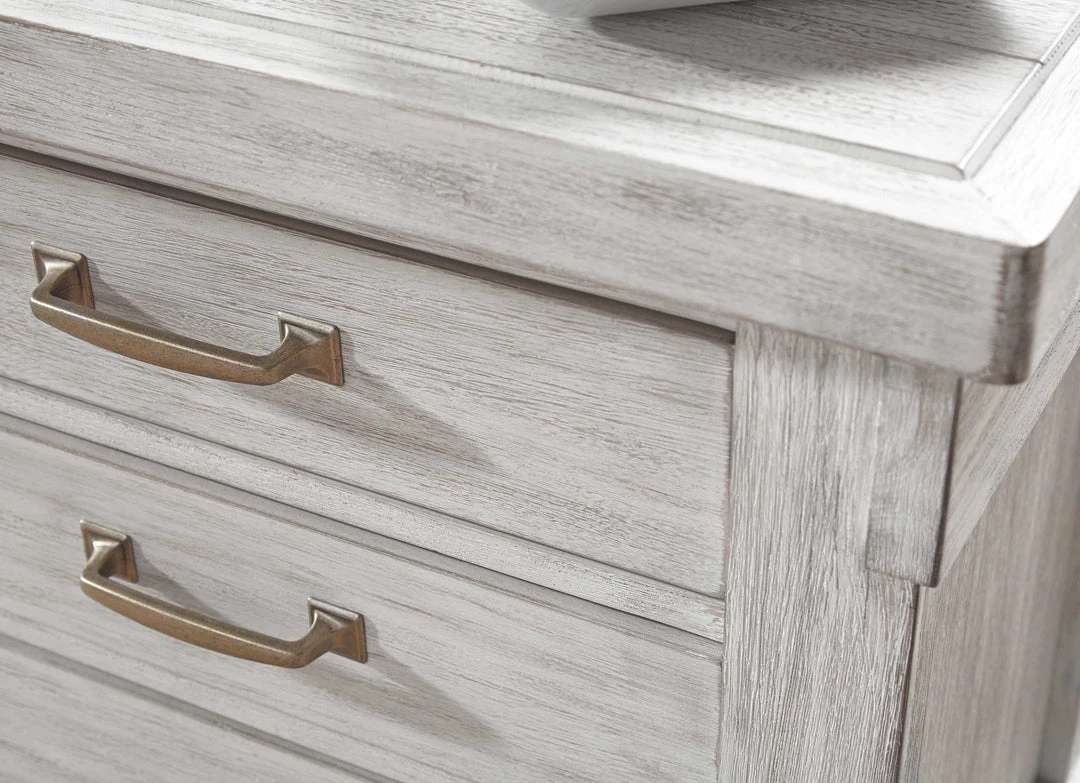 Made with Acacia veneers and select hardwood solids and finished in a white textured rub-through finish. Modern craftsman touches with the thru-tenon look throughout and generous scaling of the cases and pilasters. Panel bed features planked faux barn door panels with accenting metal hardware. Cases feature framed and planked tops with raised center panel. Night stand features an AC power supply with (2) USB charging ports. Fully finished dovetailed drawer boxes with ball bearing side glides. Hardware is an industrial bar pull with square back plates with a brushed nickel color finish. The B740-154/-156/-157/-158 bed design features a cantilevered bench incorporated into the footboard and a cross-buck panel headboard.