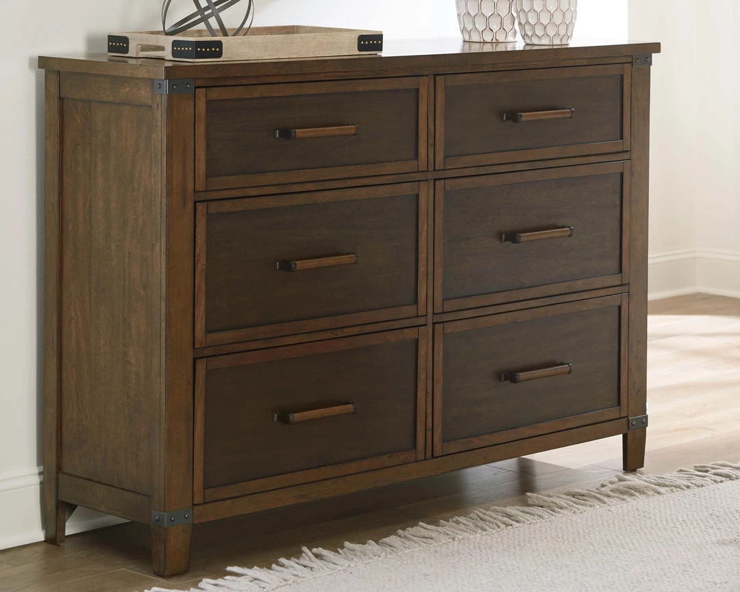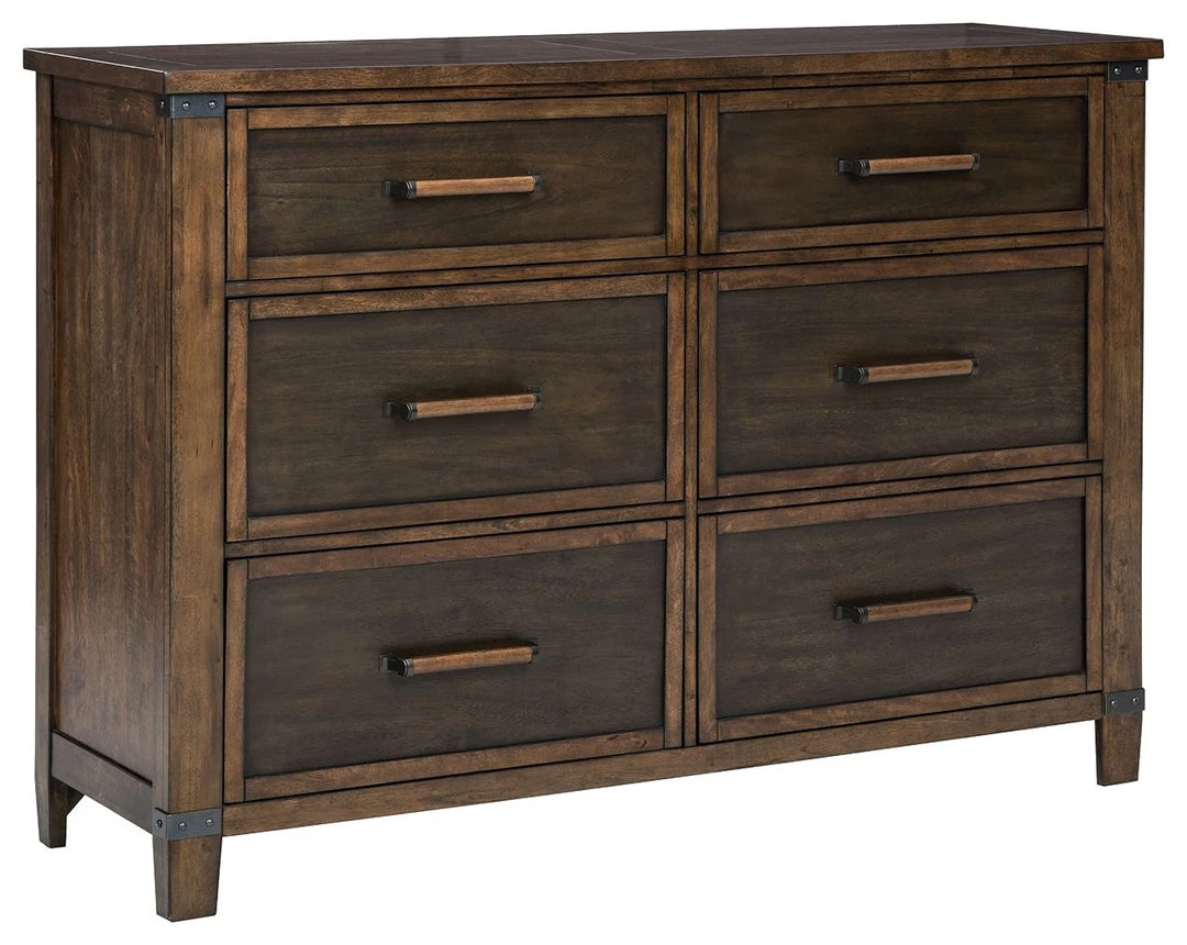 Casual two tone styling. Made with solid wood and Mango veneer. Finished with a walnut brown coloration accented with a dark burnt umber bed panels and drawer fronts. Panel bed with cross buck details with two overhead sconces for reading or ambient light. Well proportioned cases feature fully finished drawer boxes with dovetail construction and ball bearing side glides. Custom designed wooden bar pulls with metal keepers. Night stand includes a 110V power supply with dual USB charging ports. Upper drawers have black felt bottoms.