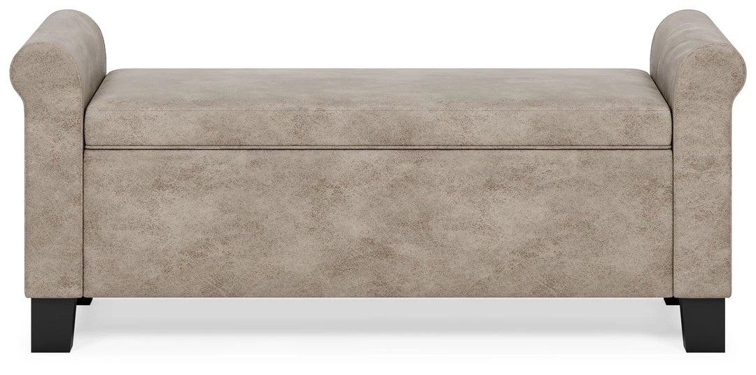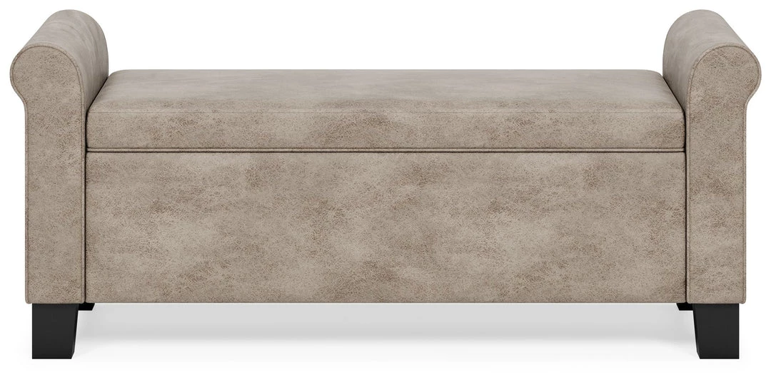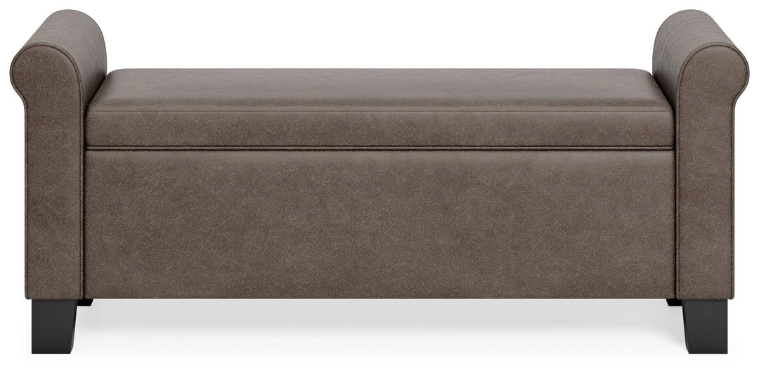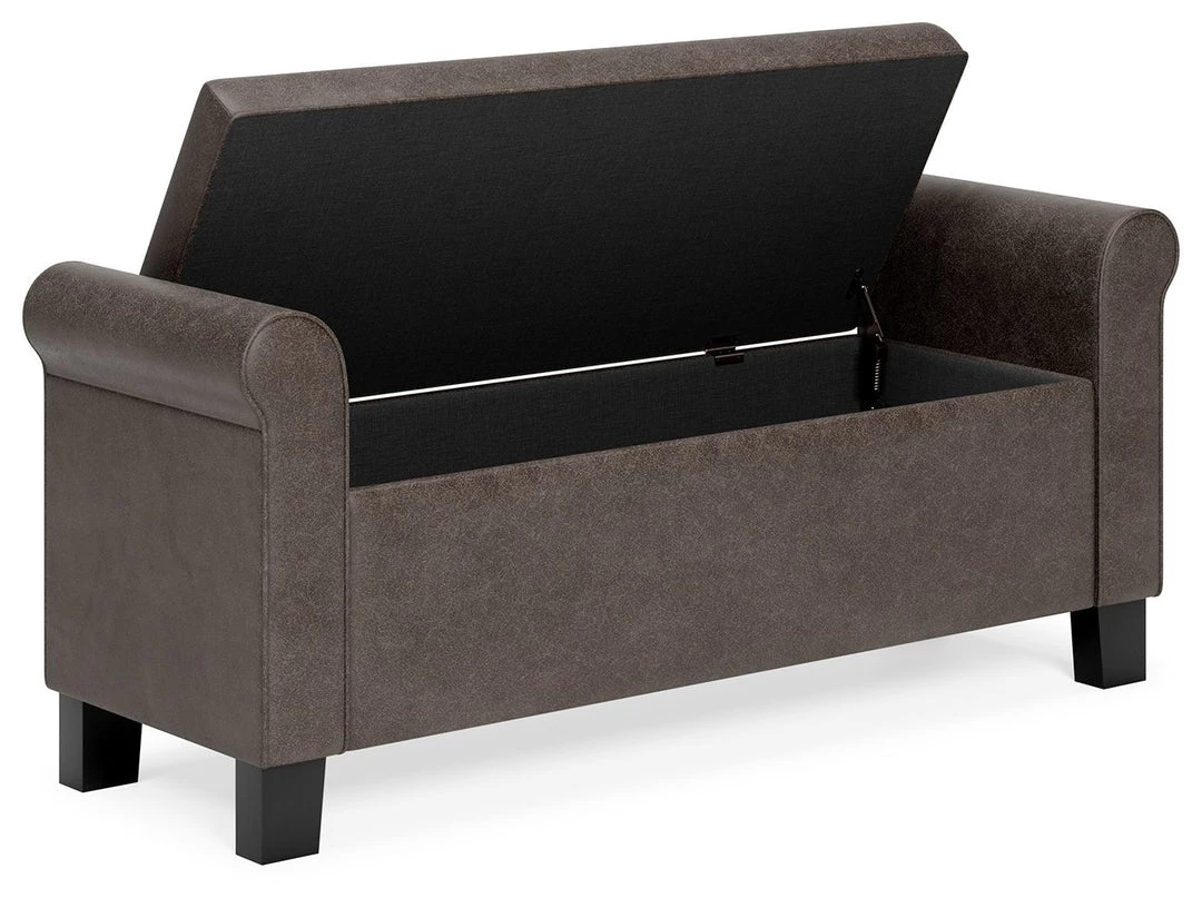 Sit and store in style. The Durbinleigh storage bench is upholstered in a sleek brown faux leather with roll arms for a touch of casual elegance. The hinged seat lifts to reveal a fully lined interior storage compartment, perfect for storing extra linens or keeping clutter hidden. Solid wood legs in a black finish cleanly complete the look.