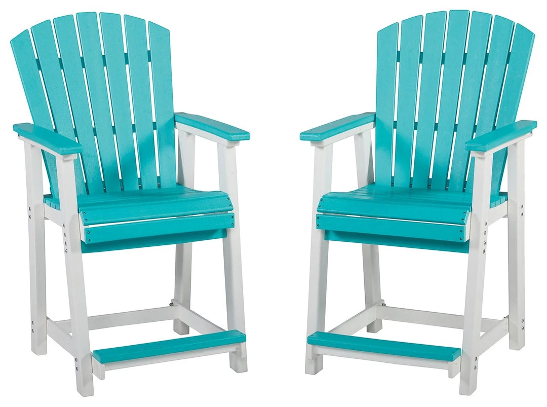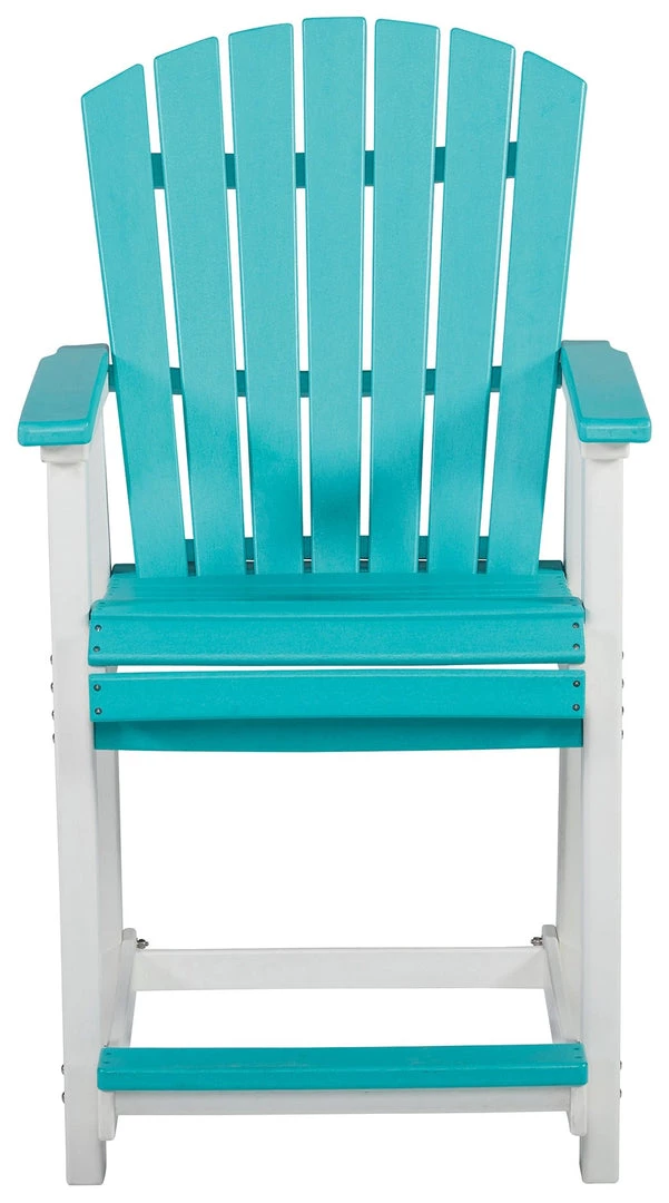 Raise the bar on outdoor living with this bar stool set. Crafted for style and durability, the counter height stool caters with sturdy armrests, an ample footrest, a high shell back and a waterfall wrapped seat for curvaceous comfort. The slatted design easily sheds rainwater. Adding to its appeal: a standout two-tone look that pairs a light turquoise and white for twice the interest.