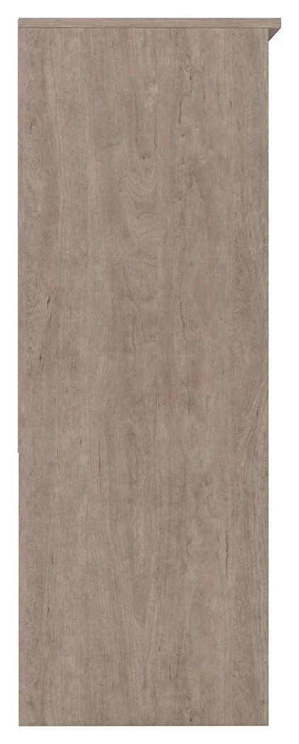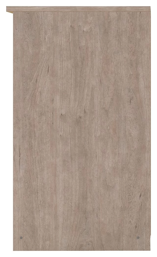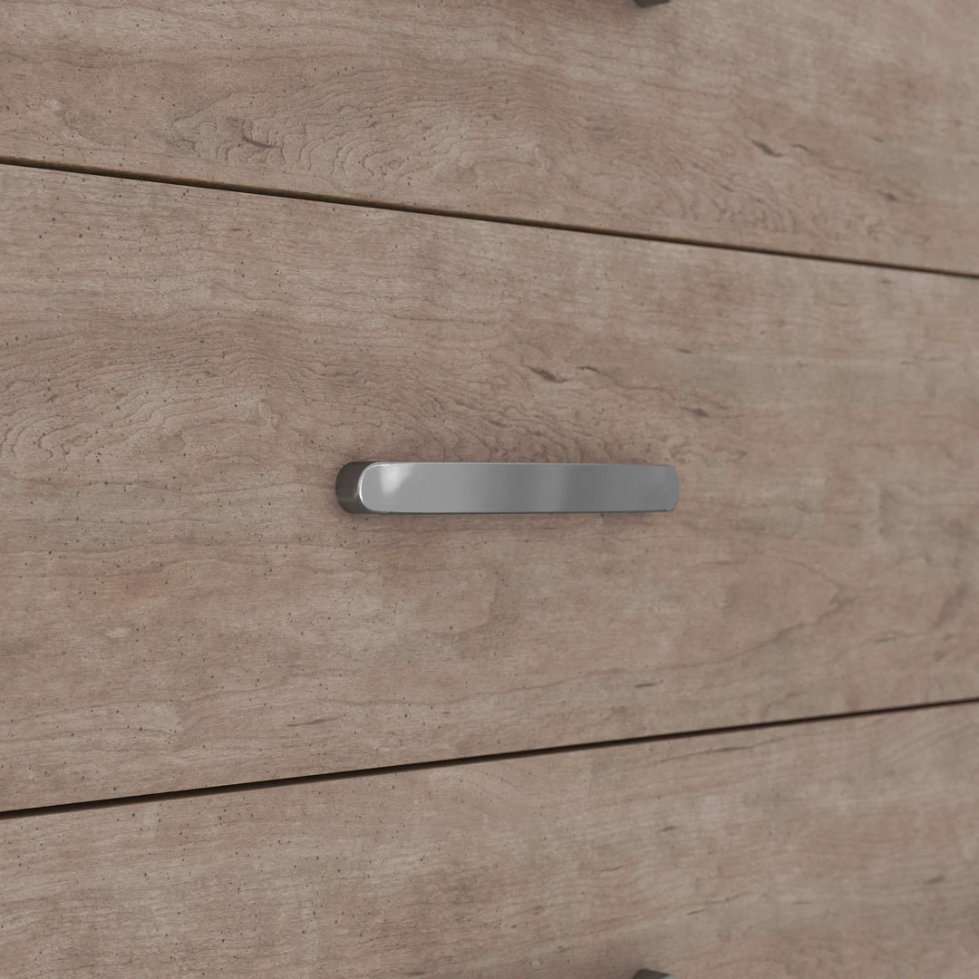 If you’re a fan of clean, crisp and contemporary interiors, rest assured this drawer chest suits you. The linear profile and flush-mount drawers are enhanced with a warm gray vintage finish with subtle pearl effect over replicated cherry grain. Large satin nickel-tone pulls are an artful touch. Hard to believe such a high-style aesthetic can be so attractively priced.
