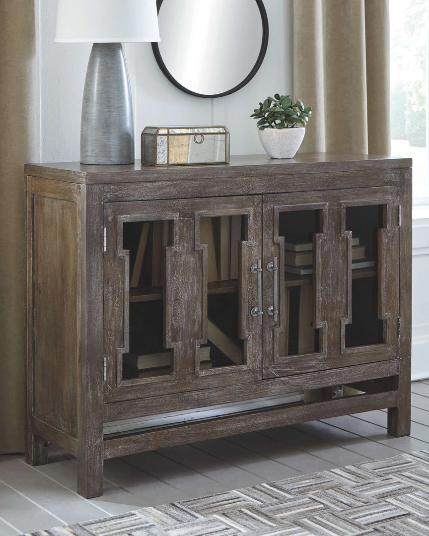 With its clean, contemporary styling and antique finish, this accent cabinet turns storage into an art form. Cutout pattern on the glass panel door fronts provides a lovely peekaboo effect. Be it in the entryway, dining room or living room, what a welcome addition.
