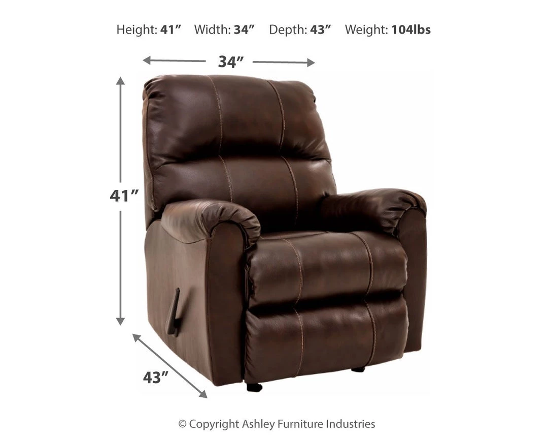 Tempting you to the pleasure of real leather throughout the seating area—where it counts—this rocker recliner in walnut brown rocks a great look and feel at a comfortable price. A simple divided back design, wrapped pillow top armrests and trendy jumbo contrast stitching keep the aesthetic cool and contemporary, while still providing such a cozy experience.