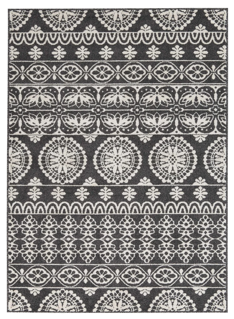 Fashioned in traditional roots, this accent rug fits the bill for poised and polished style. Patterned in varied ornate shapes and lined in black, cream and gray, it’s a tribal inspired look that’s guaranteed to bring a touch of exotic elegance in your home. We love how the symmetry adds to the harmonized look of the piece.