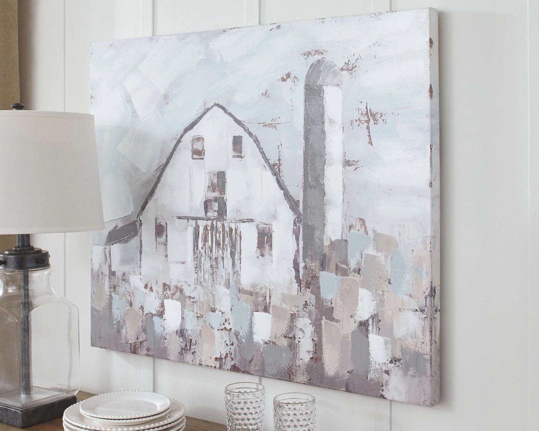 Make your modern farmhouse or cozy cottage complete with this brilliant rendition of barn wall art. Muted palette blends shades of blue, gray and white for a fabulously faded aesthetic. Gallery wrapped canvas is right on trend.