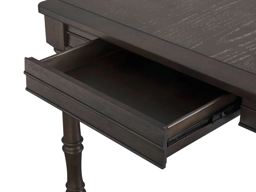 The perfect complement to any dining room, this dining table is simple in design and stands on elegantly turned legs. With a dark brown wire-brushed finish and detailed woodwork, it takes traditional style in a new direction.