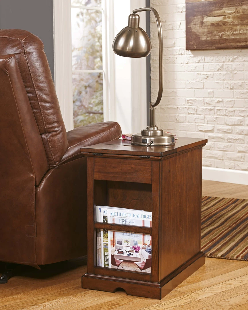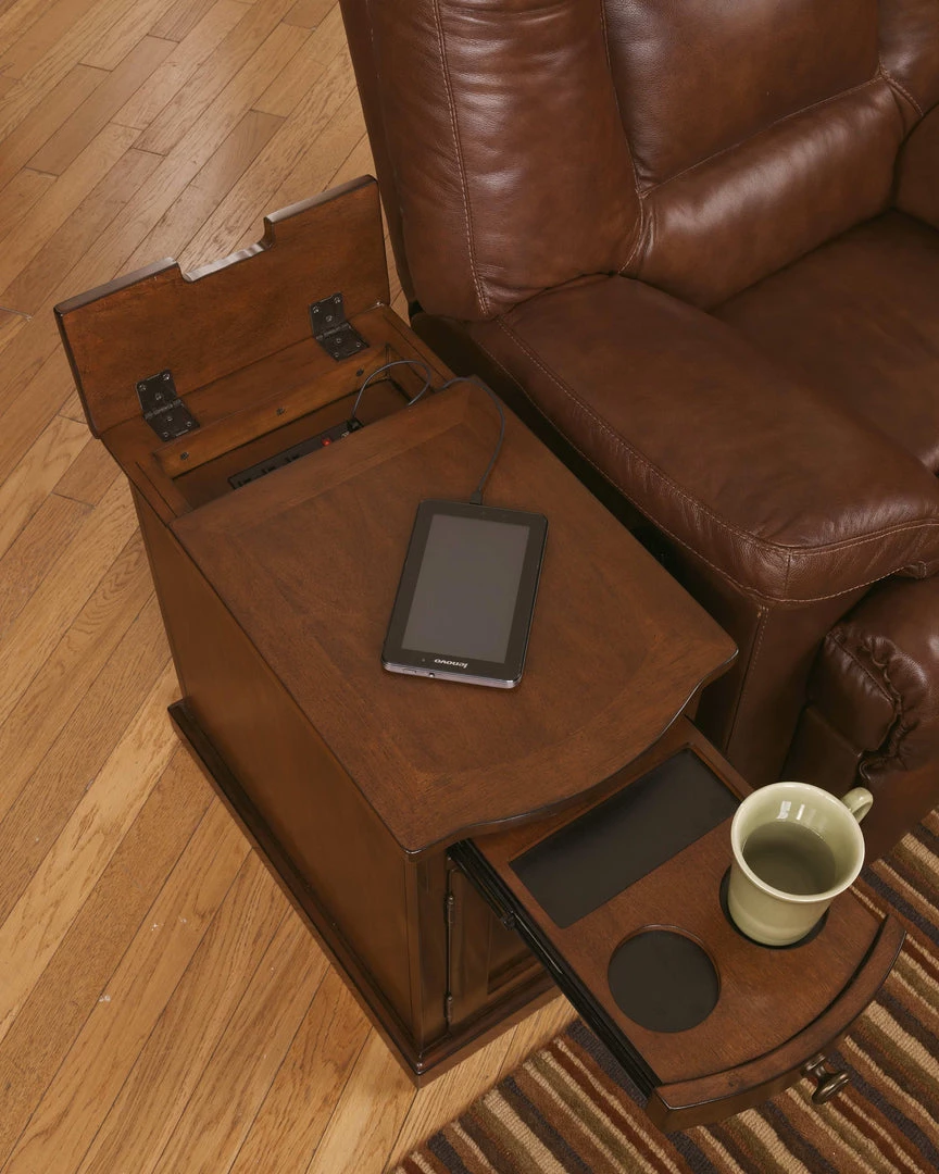 So much form and function in a beautifully compact piece of furniture. Richly crafted with a warm and rustic style, this chairside end table puts it all within reach, including a flip-up top panel revealing a power port—perfect for keeping your phone or laptop charged. Hidden twin cup holders and interior shelved storage are also a welcome surprise.