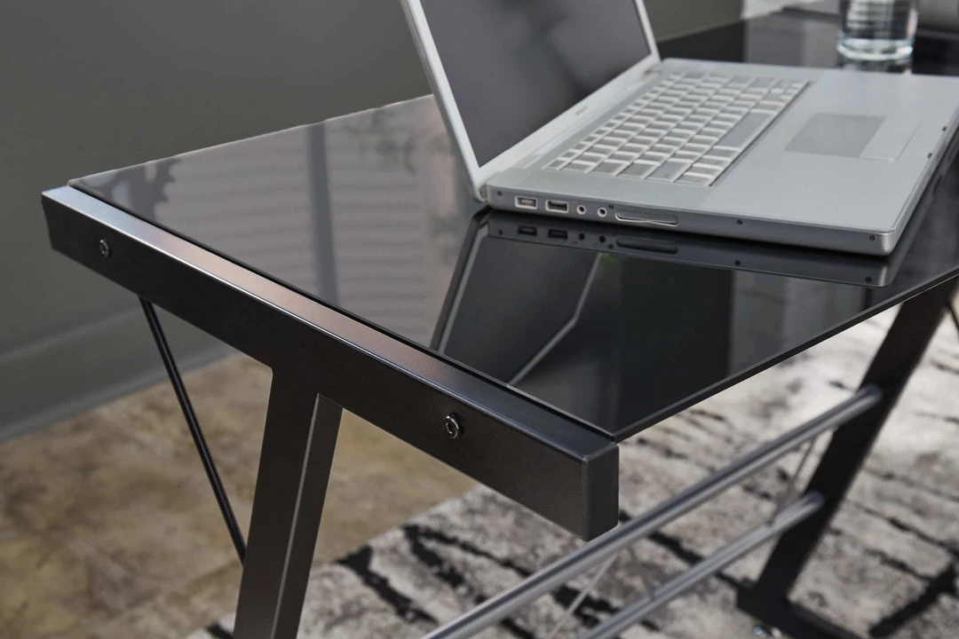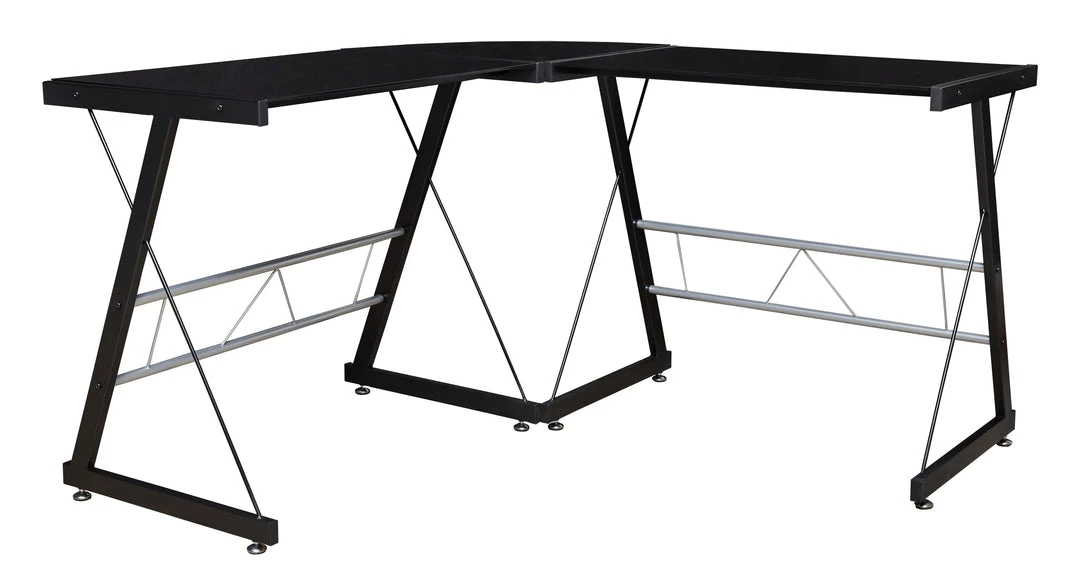 Bring a midtown feel to your office with this L-desk. The three-piece modular desk can easily transform a small space or spare bedroom into a stylish work-from-home environment. With a satin black powder coated finish and contrasting chrome-tone stretchers, this desk makes a bold statement while providing ample work space.