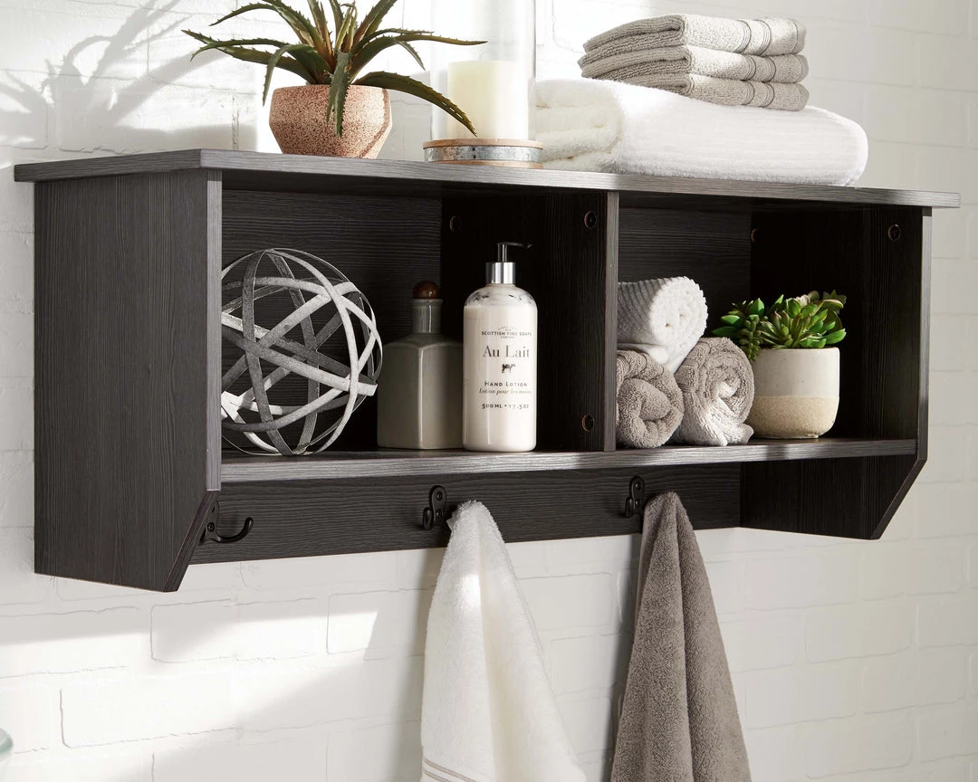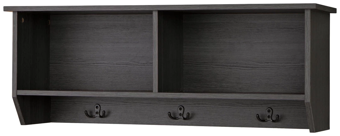 Short on organization? Look no further than this space saving wall-mount shelf. The antiqued gray finished wood brings warmth to any room, while the three hooks make storage of coats and other accessories a breeze.