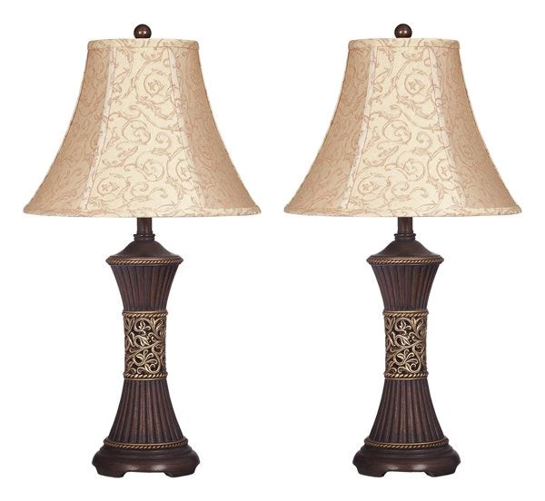 Inspired by the curves and whirls of nature, this table lamp set brings a bit of the outdoors in. Beige shade with scrolling greenery motif sits atop ribbed, hour-glass shaped base. Vine accent band completes the natural look.