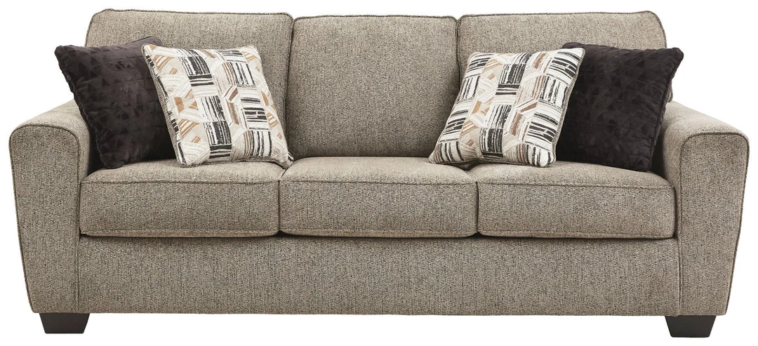 For seating that feels as good as it looks, the choice is clear. This sofa has a neutral mocha hue that blends effortlessly with any room decor and color scheme. Its soft textured chenille fabric with chevron effect beckons you to sit and relax. Wide track arms elevate the look with a touch of contemporary sensibility, enticing you to settle in and stay awhile. Caramel and black toss pillows are a designer favorite.