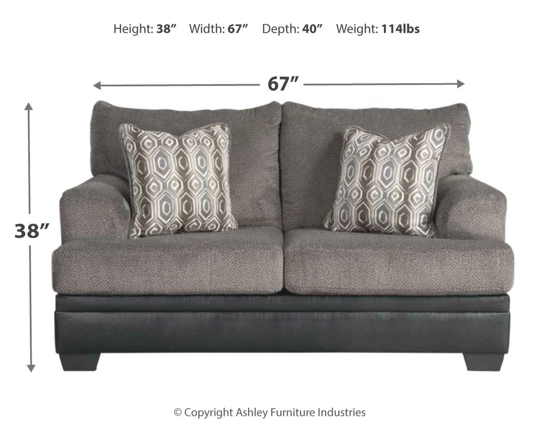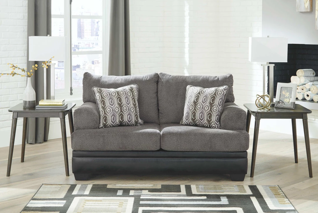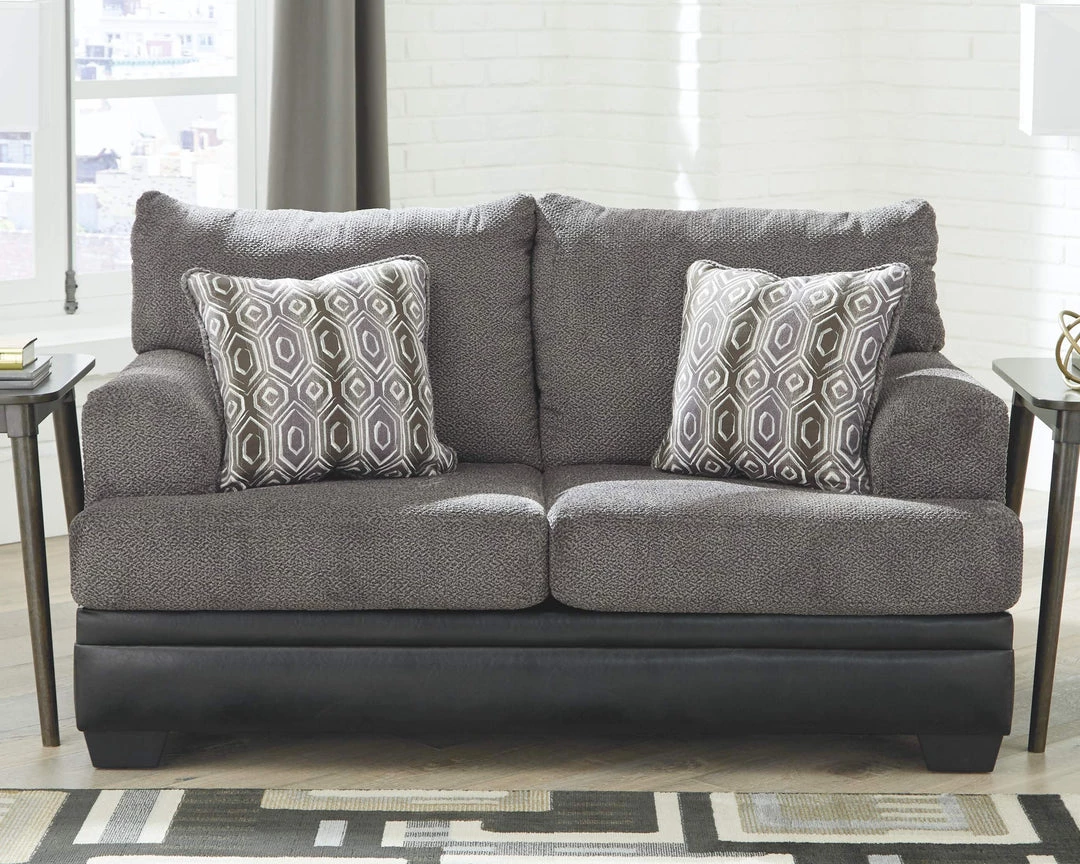 Comfort is inevitable with this loveseat. Handsome profile is teeming with chenille softness. Smoky gray textured cushions meet black faux leather for a quality look. Throw pillows with a trendsetting geometric pattern season this sofa with extra style flavor.