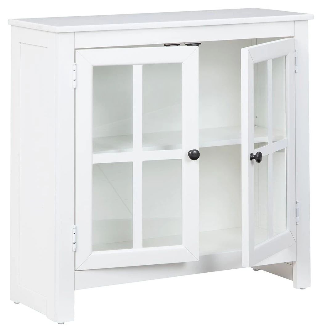 Function and style merge perfectly with this accent cabinet. Constructed of wood in a white finish, the accent cabinet adds an elegant touch to any room. Two doors and an adjustable shelf make for multiple storage solutions. Black finished metal door pulls add a finishing touch and a lattice door front with clear inset glass allows you to show off what you store.