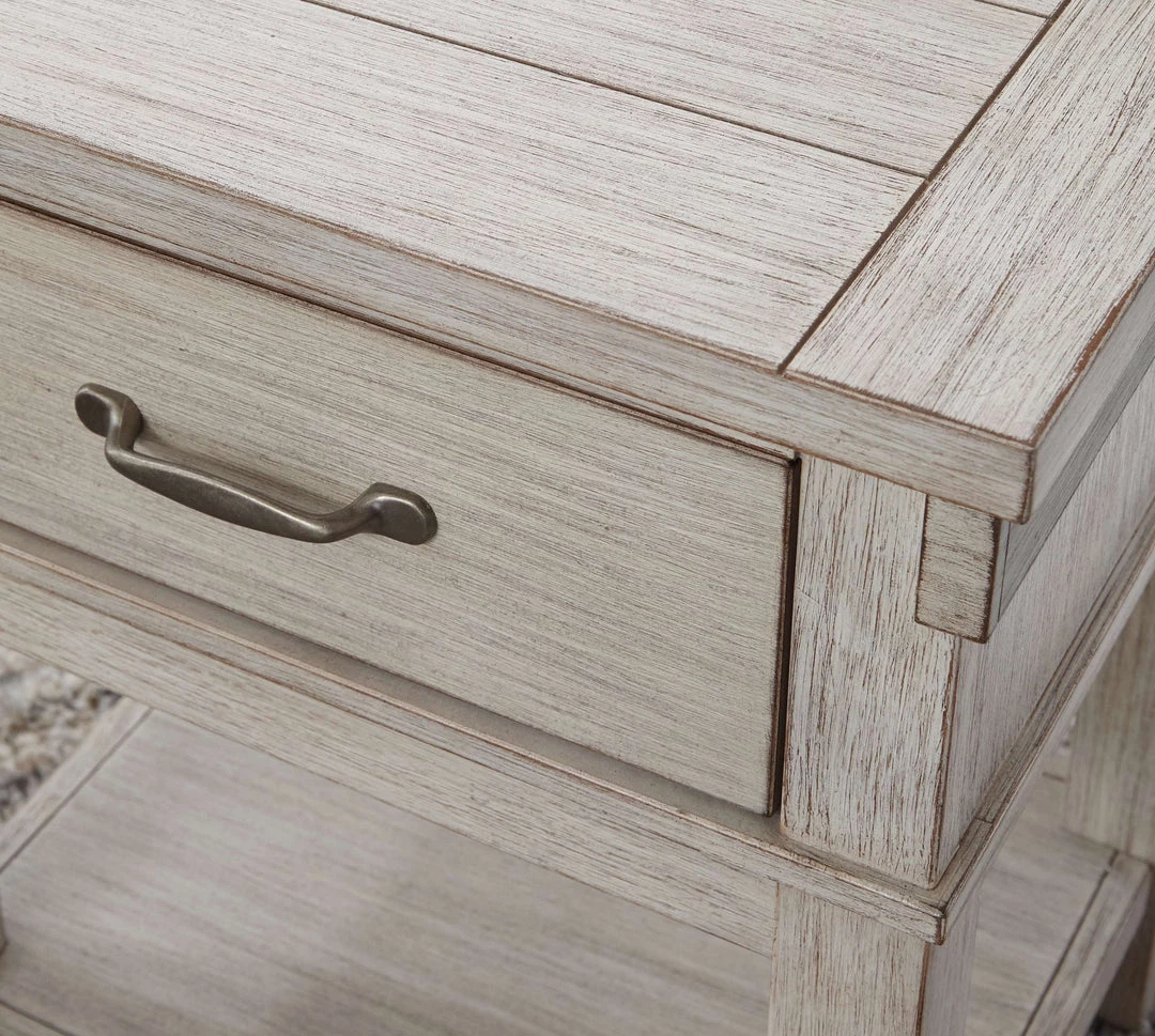 Enhance your bedroom with a touch of casual glitz. This nightstand’s rubbed white finish with a blend of rich texture and woody undertones is sure to please. The smooth-gliding drawers feature dovetail construction for strength and durability, and the open-air shelf provides extra bedside storage space. The chic bar handle in a brushed nickel-tone finish is a brilliant touch.