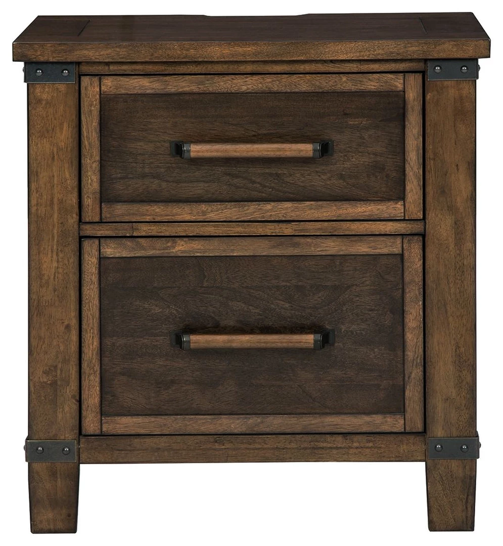 What a fresh interpretation of casual lifestyle design. Inspired by American craftsmanship, but with an elevated sensibility, this nightstand blends distinctive details such as metal corner accents and smooth-gliding drawers for an easy-living aesthetic. Those who appreciate the beauty of wood will be doubly impressed with the two-tone walnut and burnt umber finish that imparts an added level of refinement. Dual AC power plugs and USB slots subtly mounted on the back keep your electronics charged up and ready to go.