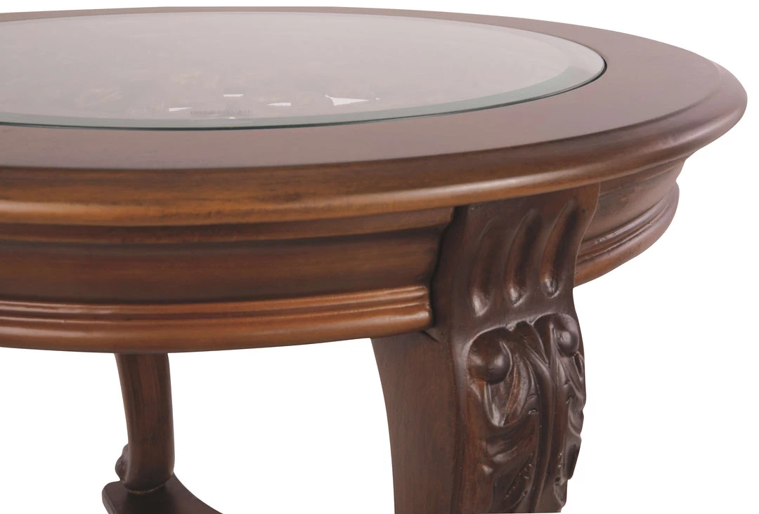 This round end table deserves a toast for incorporating so many elements so seamlessly. Swirls of metal accents add a lovely dimension under a beveled glass inset tabletop. Their fanciful pattern is echoed in the carvings and curves of the richly stained legs and stretchers.