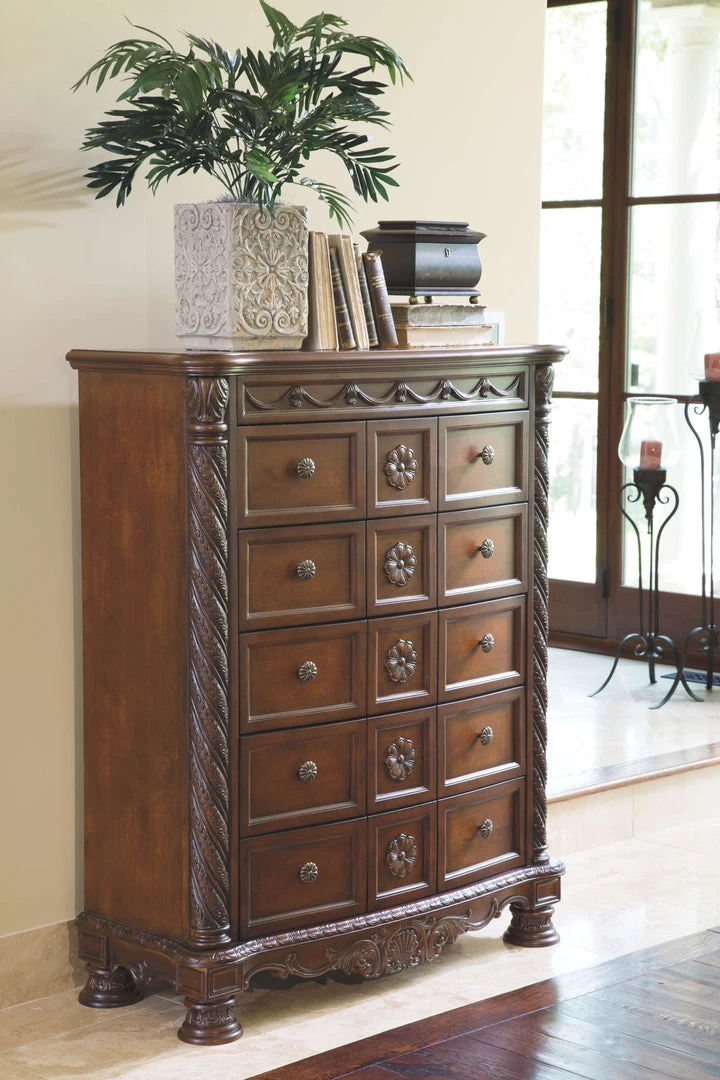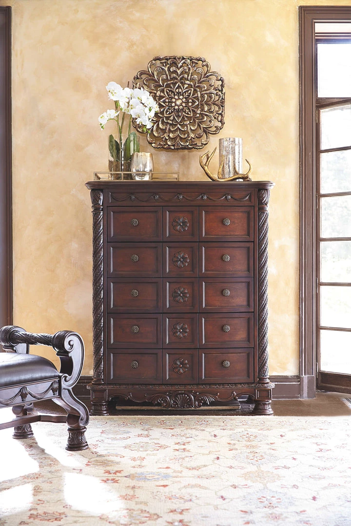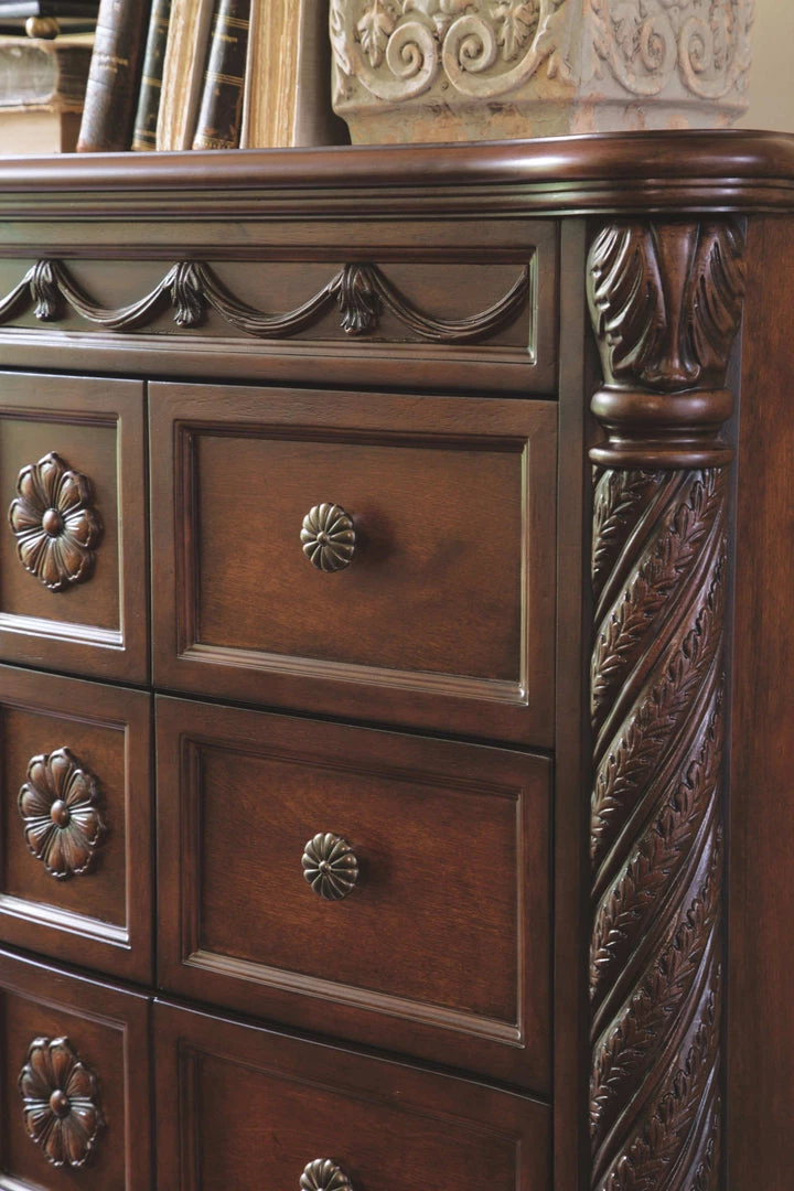 Inspired by the grandeur and grace of Old World traditional style, this chest of drawers is nothing short of stunning. A choice blend of materials is accented by detailed ornamental appliques. Five smooth-gliding drawers make this exceptional piece a wardrobe essential.