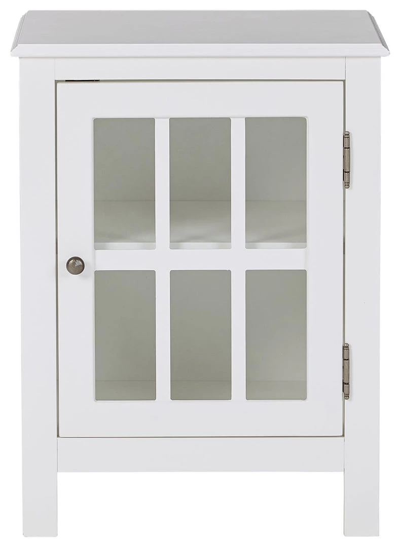 Casual style and function are made easy with this accent cabinet. This versatile storage solution in a white finish is a perfect place to stack bowls, plates and linens. The lattice door front with clear inset glass allows you to show off its contents, allowing for endless decorative possibilities.