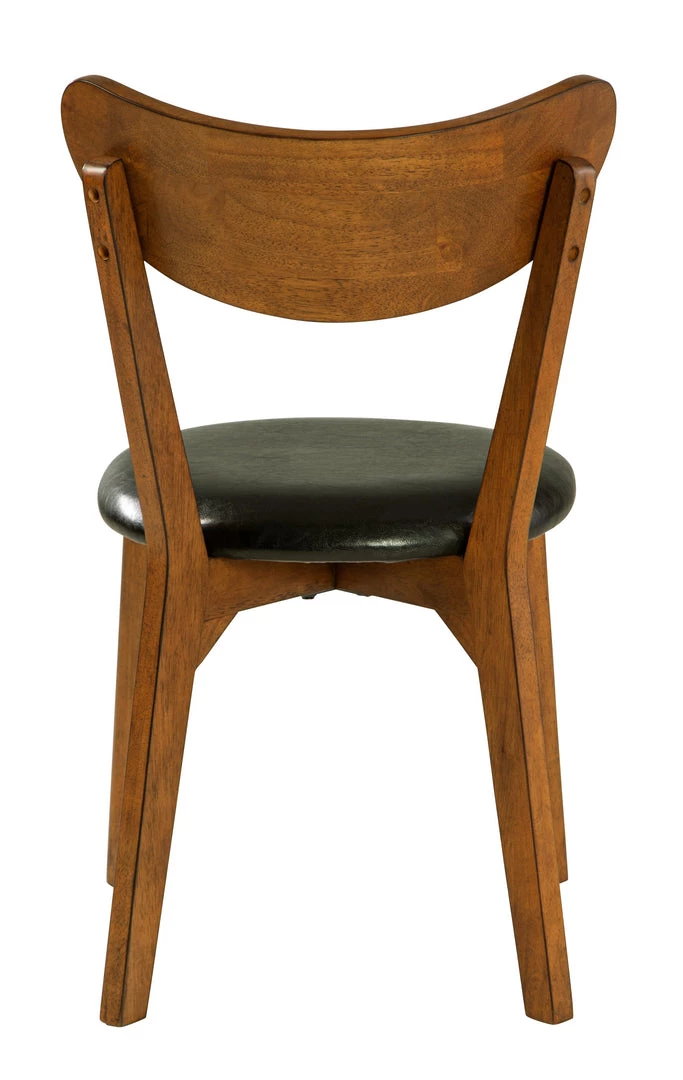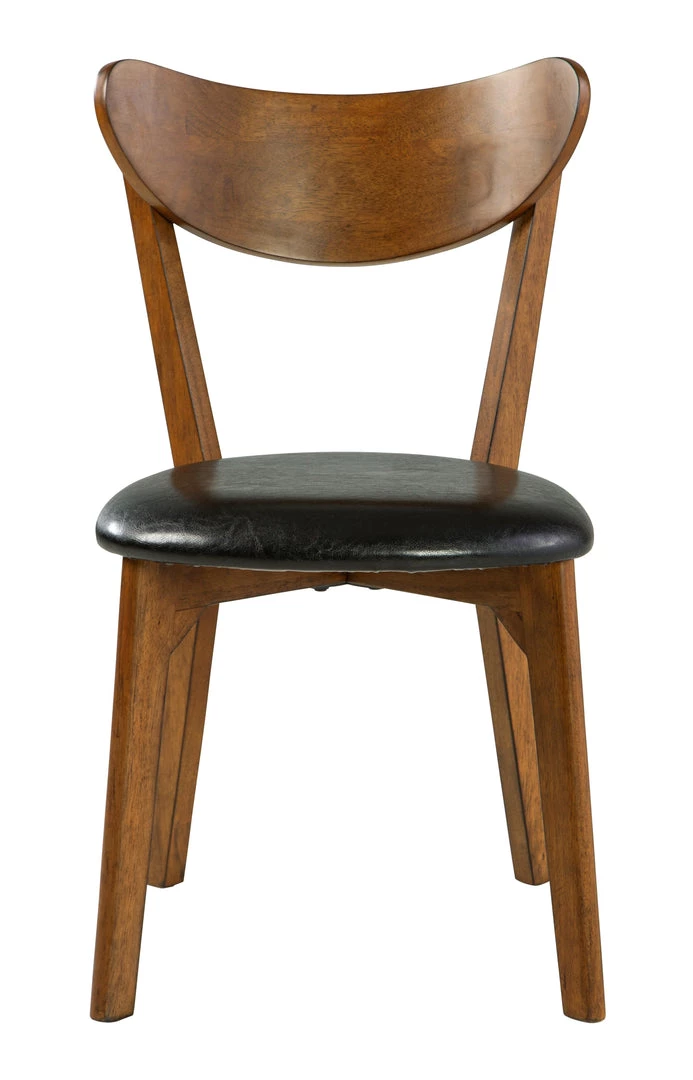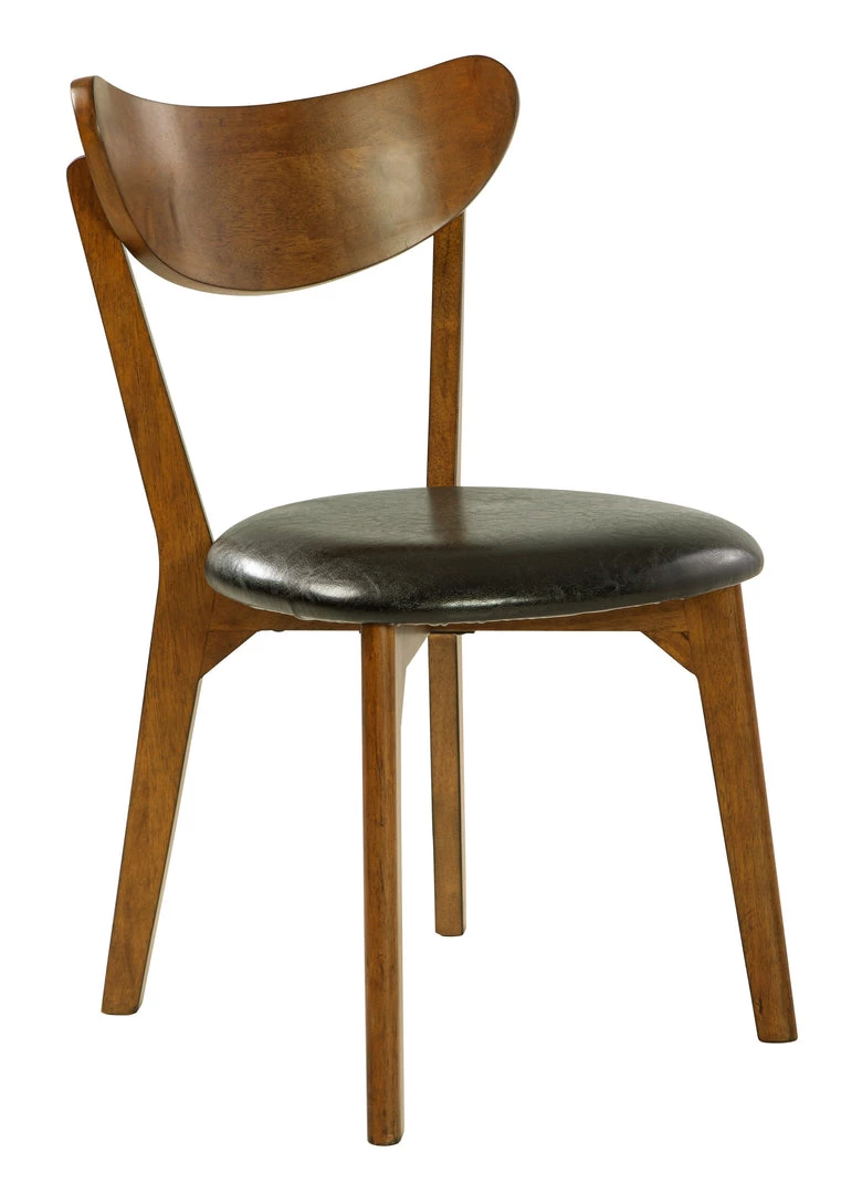 - Chairs with foam-cushioned seat upholstered with dark brown faux leather