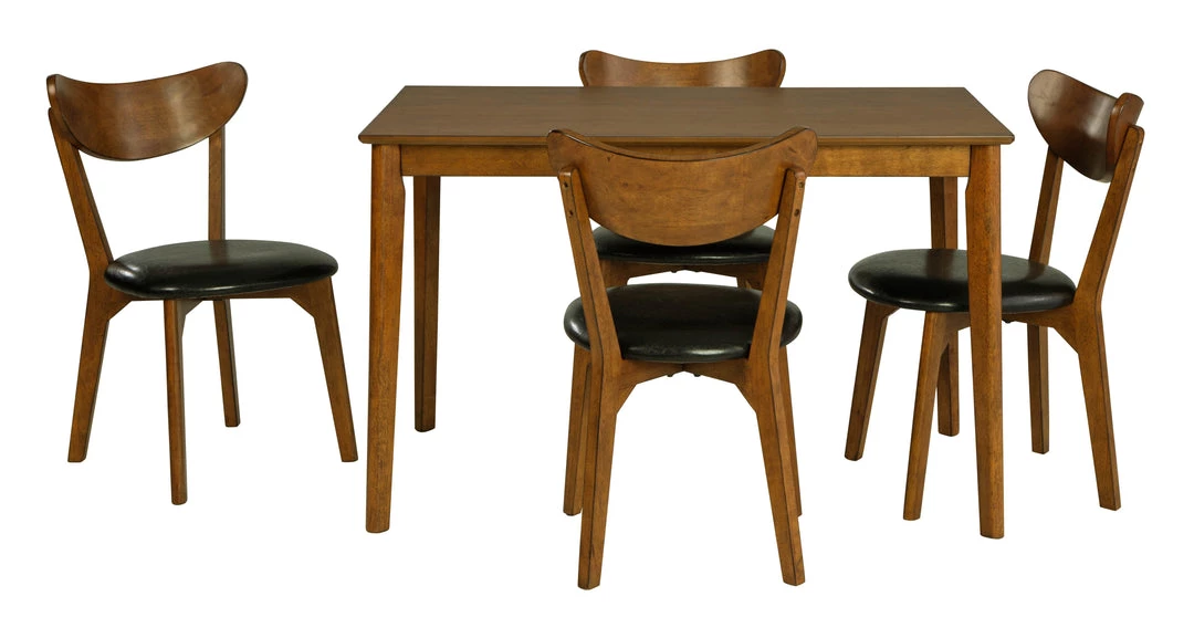 Keeping your home urban cool can be difficult in a small space. This dining table set makes it look easy. A modern contemporary style made for small space living, the set is finished with a light brown cherry color to fit modern decor. The four included chairs sport foam-cushioned seats upholstered with a luxe dark brown faux leather for added cool. Includes adjustable, high-quality levelers attached to the two front chair legs to ensure stability on uneven surfaces. Use them to eliminate wobble and give your family and guests a comfortable, stable and relaxing dining experience. With the table and four chairs arriving in one box, this dining set proves big style comes in small packages.