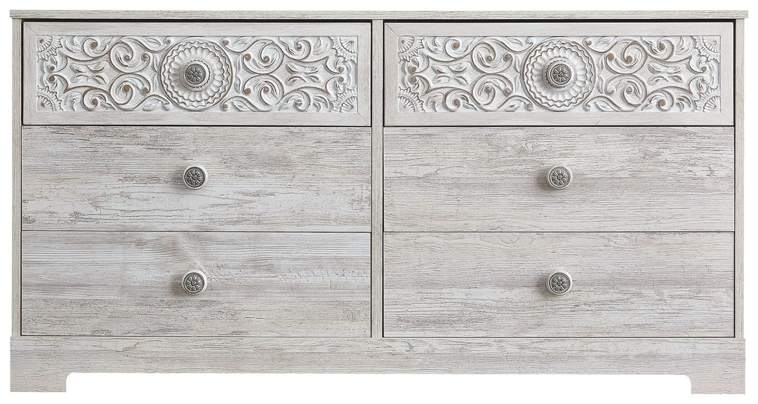 Paxberry – Opaque Whitewash – Six Drawer Dresser – Medallion Drawer Pulls