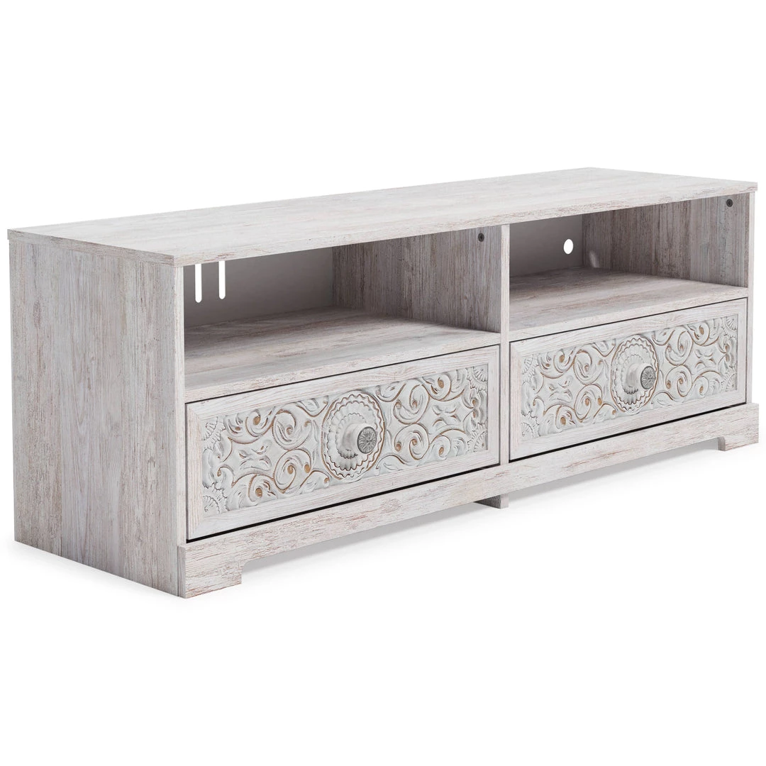 If it’s coastal chic or cottage quaint style you long for, this whitewashed TV stand is sure to satisfy. Its distinctive weatherworn finish conveys an easy-breezy sensibility, perfect for a relaxed vibe. Carved medallions on the storage drawers give this electronics hub a high-end aesthetic.