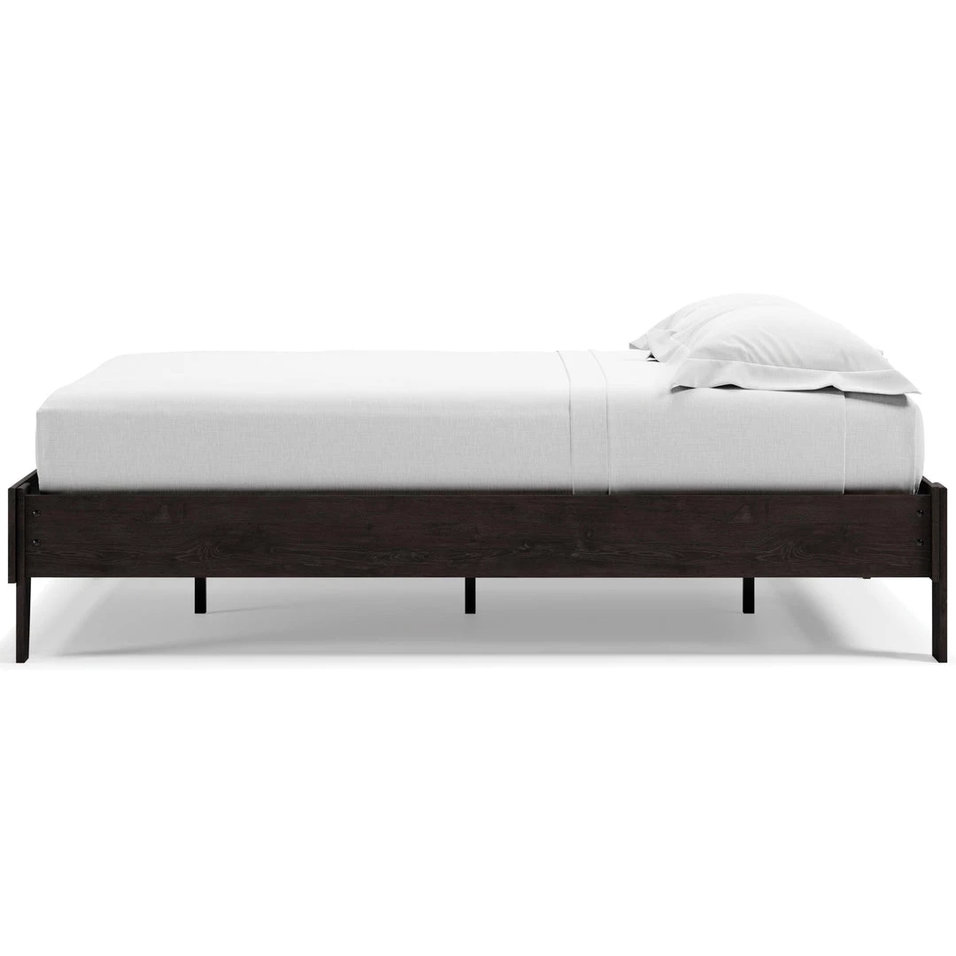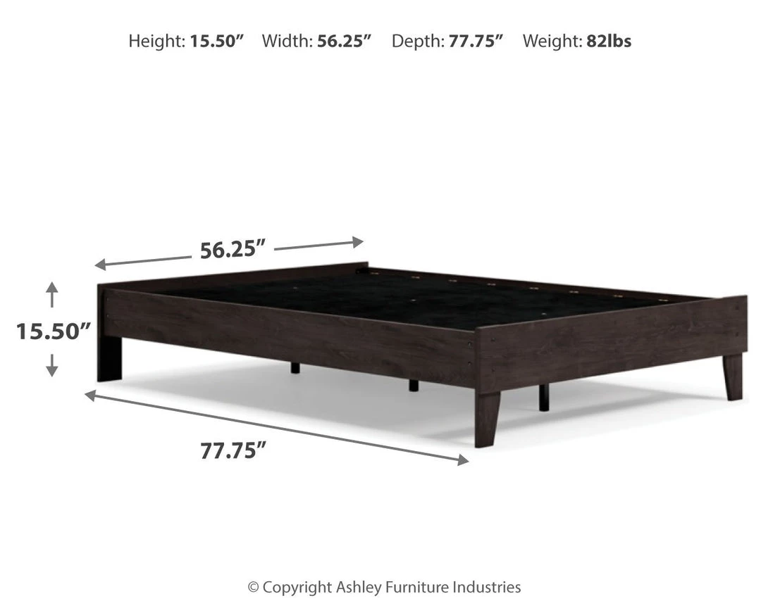The perfect marriage of simple and contemporary style, this full platform bed is a charming addition to your home. This bed keeps things simple with its dark charcoal finish over replicated oak grain. Best of all, this bed includes a footboard, rails and platform–no additional foundation or box spring needed.
