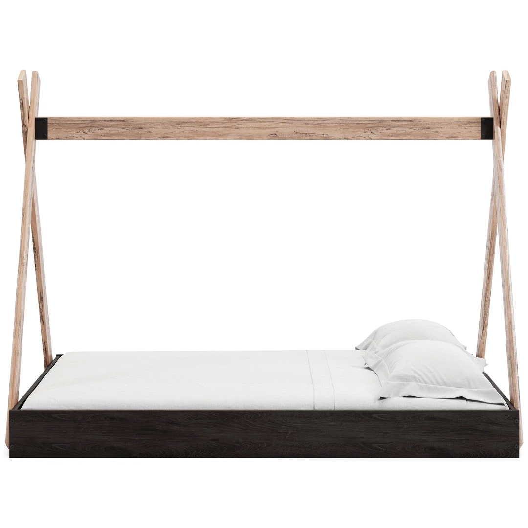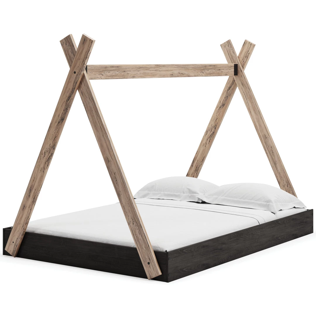 Adventure awaits with this full tent complete bed in a box. An effortless blend of simple-yet-contemporary style, it features an expressive two-tone look, with a dark charcoal finish over replicated oak grain with an authentic touch and a replicated sugarberry wood grain. This complete bed in a box requires no additional foundation, making it a functional yet unique addition to your home.