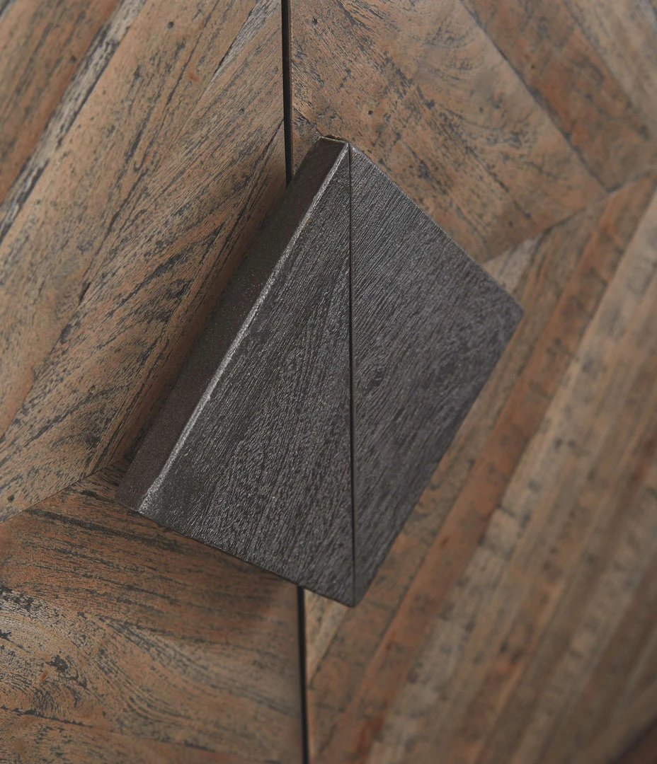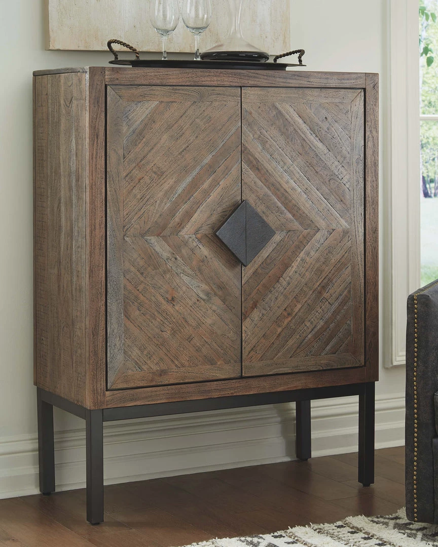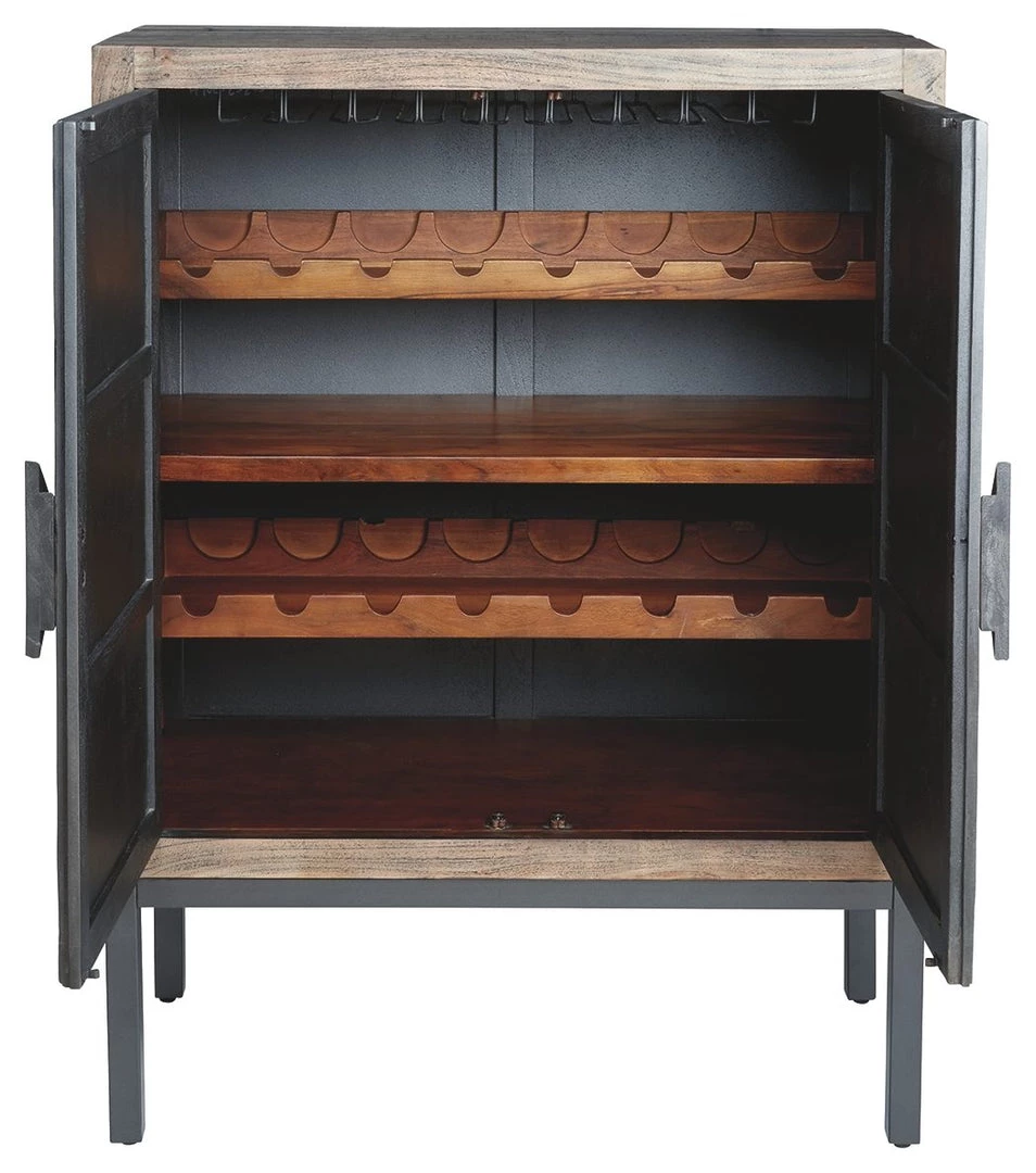 A swanky essential for the entertainer, this bar cabinet brings back cocktail hour in high style. Behind the diamond inlay pattern doors with shapely wooden pulls you’ll find dual racks for up to 16 wine bottles, holders for 27 standard wine glasses and an adjustable shelf to serve your needs. Pairing of antique gray wood and black finished metal is so pleasing to the palette.