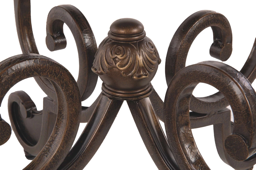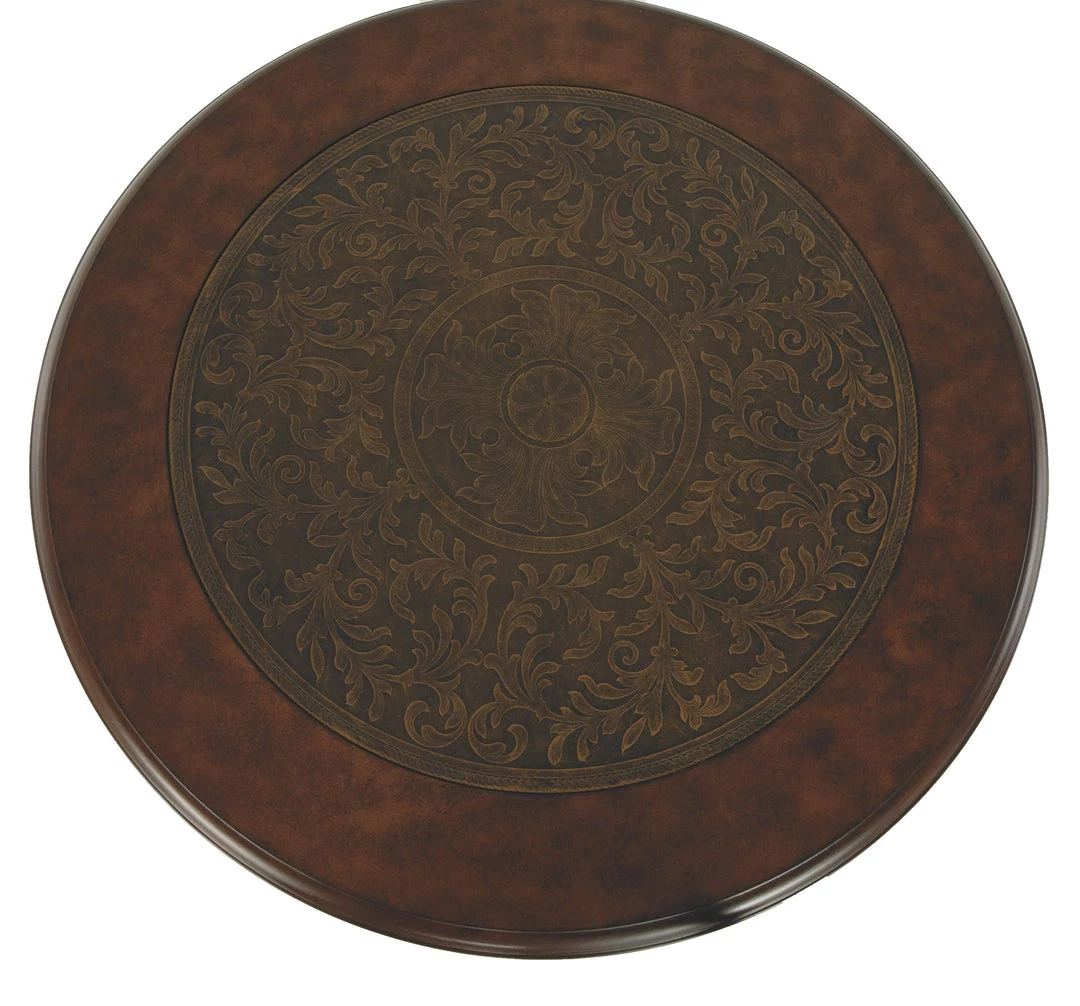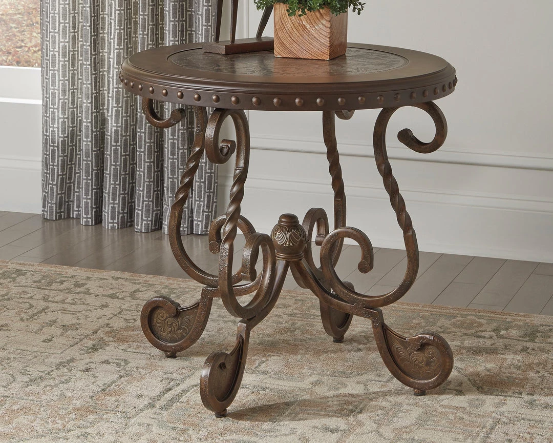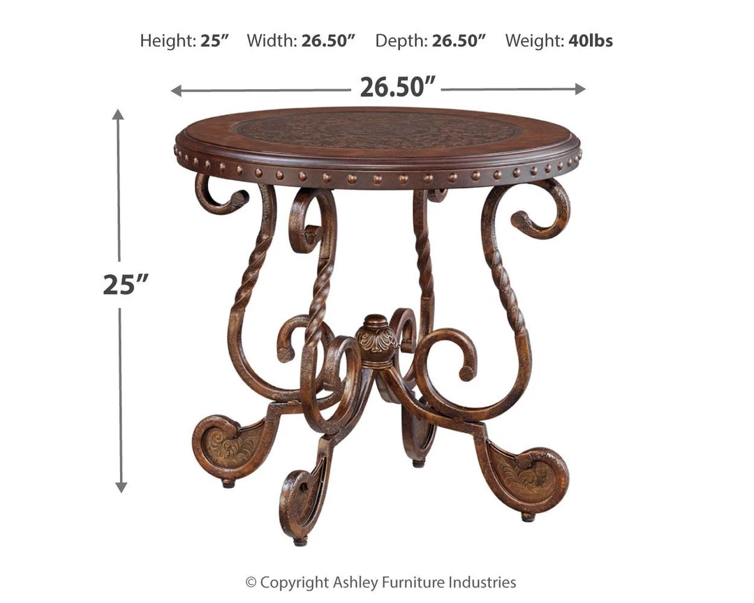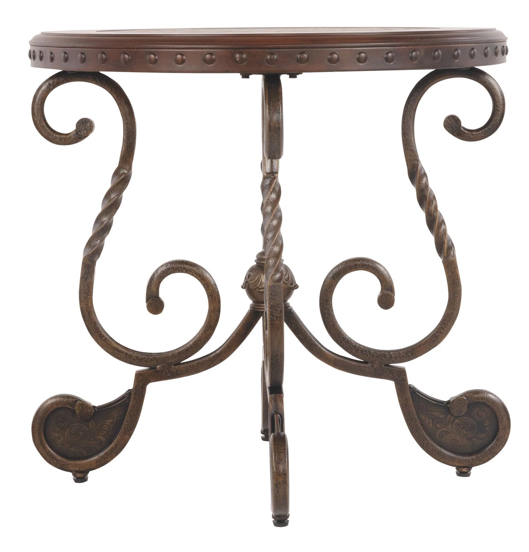 Surrounding yourself with beautiful things is perfectly embodied by this round end table. The spectacularly finished metal and nailhead-accented top is supported by a scrolled metal base in an antiqued finish.