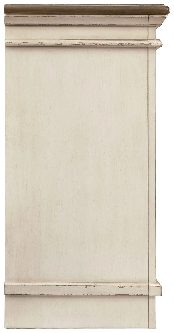 Elevating the art of traditional cottage styling, this TV stand is sure to serve you beautifully for years to come. Antiqued two-tone finish blends a chipped white with a distressed wood tone top for added charm. Cabinet door features inset mirror with filigree moulding for a fanciful twist.