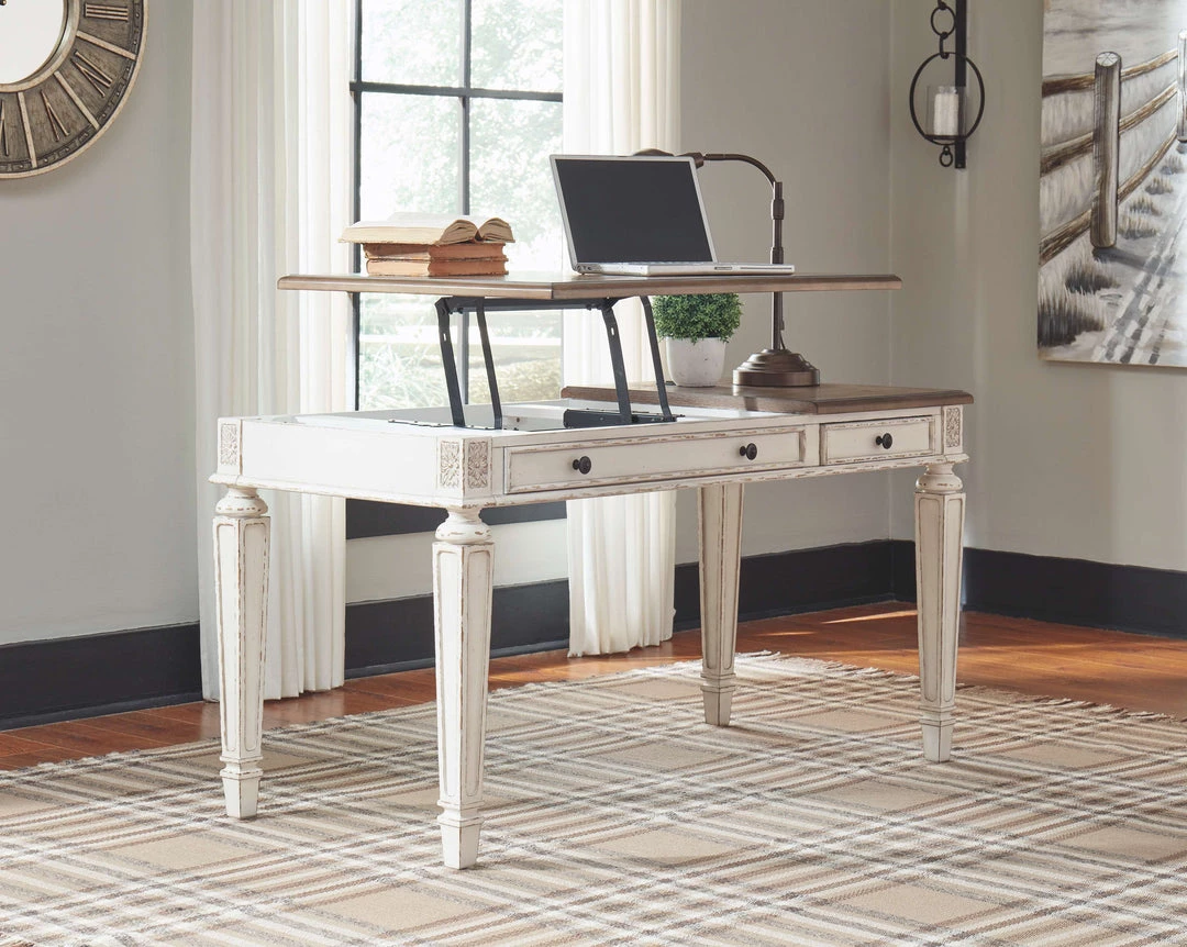 Elevating the art of traditional cottage styling, this desk is your heavenly home office realized. Antiqued two-tone aesthetic blends a chipped white with a distressed wood tone top for added charm. Framed drawer fronts, decorative corbels and elegantly turned and tapered legs add refinement, while dark bronze-tone knobs lend a classic touch. Spring lift top raises the surface to a comfortable standing position, for a healthy alternative. Built for looks and productivity, the built-in power supply and dual USB ports keep your devices close at hand and ready to go.