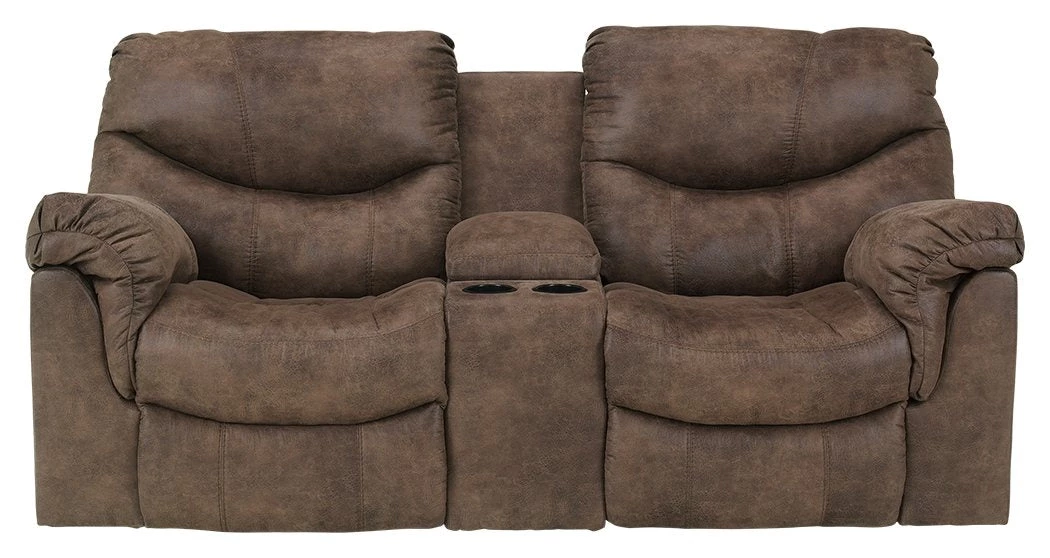 Crafted to fit like a glove and cradle you in comfort, this reclining loveseat with console is just the right blend of tough and tender—offering the look of weathered leather you treasure, with the luxurious feel of supple suede that never gets old. Stylish details such as jumbo stitching—along with a split back for extra lumbar support and double-stuffed armrests—complete this fine faux leather piece.