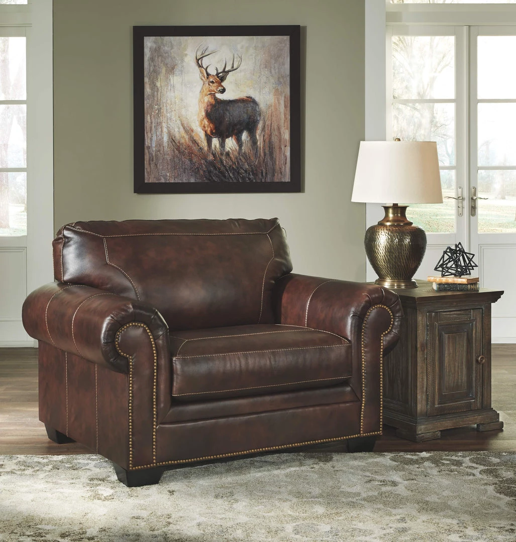 Love at first sit. You can enjoy the pleasure of real leather while still living well within your budget with this oversized chair in walnut brown. Sporting a pleasing profile with classic roll arms, jumbo stitching and nailhead trim, this generously scaled chair will win you over with real leather throughout the seating area, where it matters most. A skillfully matched faux leather elsewhere saves you money without sacrificing high style.