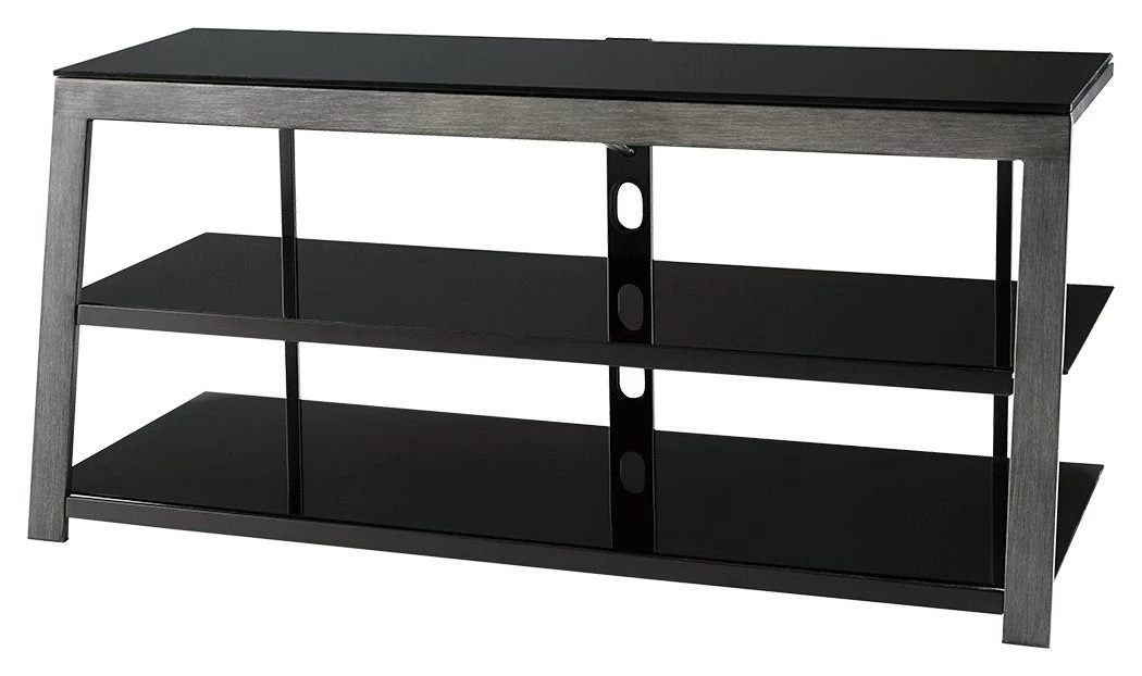 For those who appreciate open-concept design, this TV stand is beautifully in tune. Cool and contemporary, this TV stand really steps it up with cantilever styling and a two-tone finish that blends an aged silvertone metal frame with sleek black glass shelves. A wire management support bar helps maximize the minimalism.